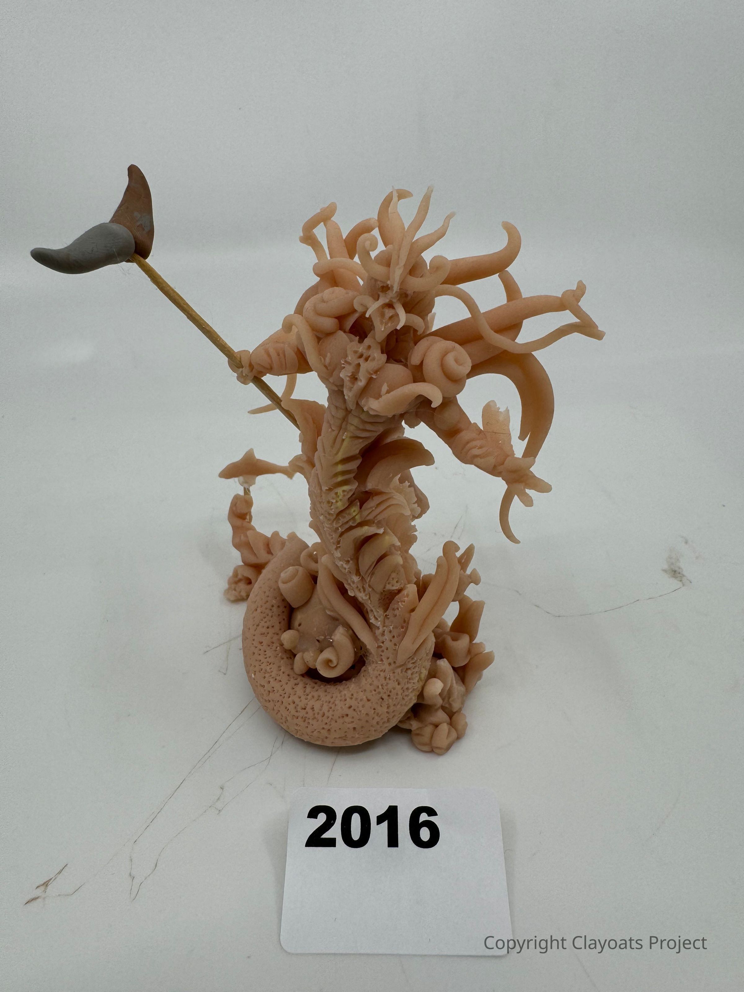 The image depicts a complex and intricately designed sculpture made of a light brown material, resembling a mythical sea creature with swirling tentacles and fin-like appendages, holding a staff with a unique, curved blade at the end; the artwork is mounted on a textured, circular base surrounded by smaller, textured elements.