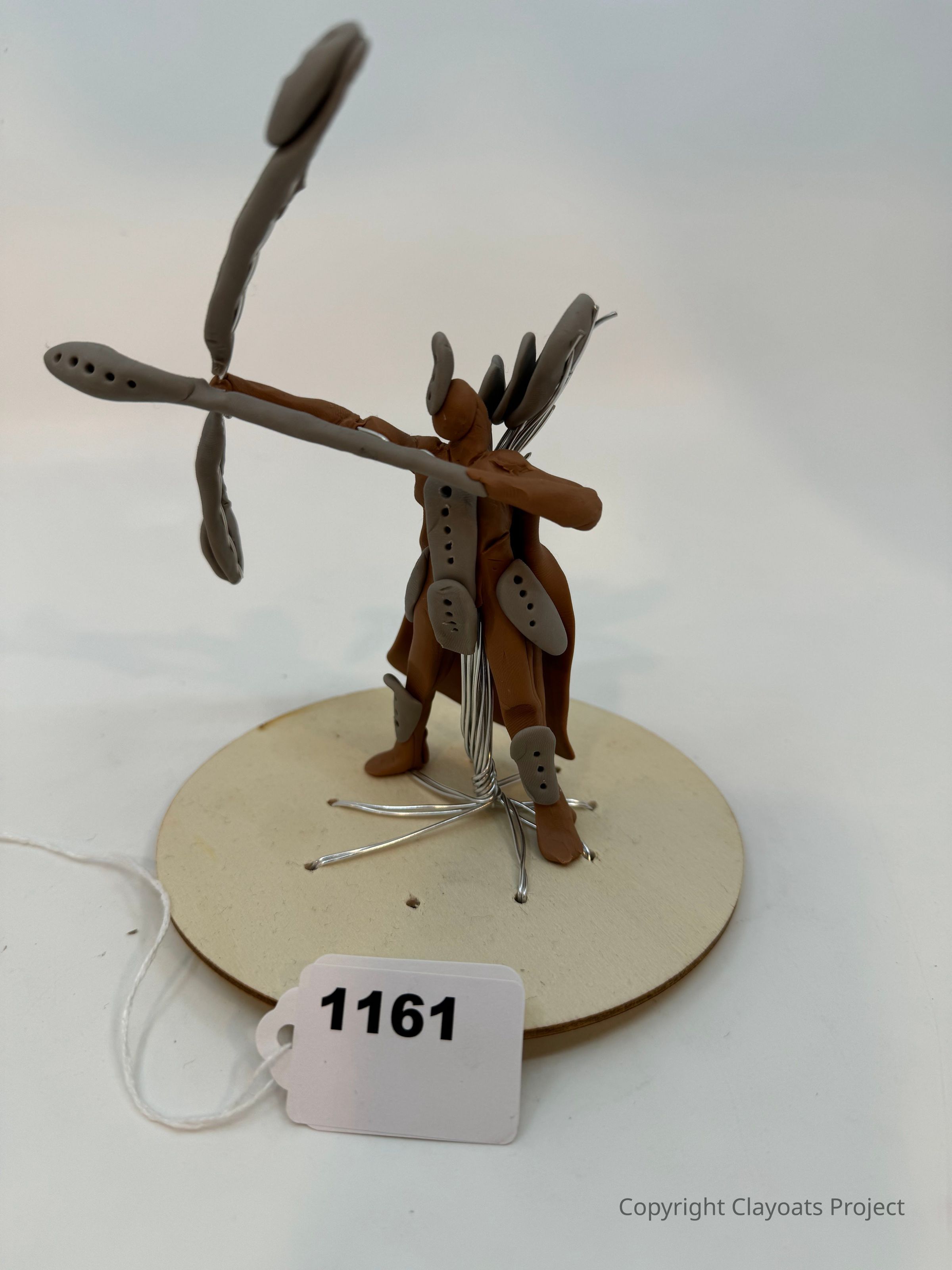 The image shows a small, abstract sculpture of a humanoid figure made from clay with elongated limbs and gray details, standing on a circular wooden base, with wire supports visible near its feet; the figure is positioned in a dynamic pose, suggesting movement or action.
