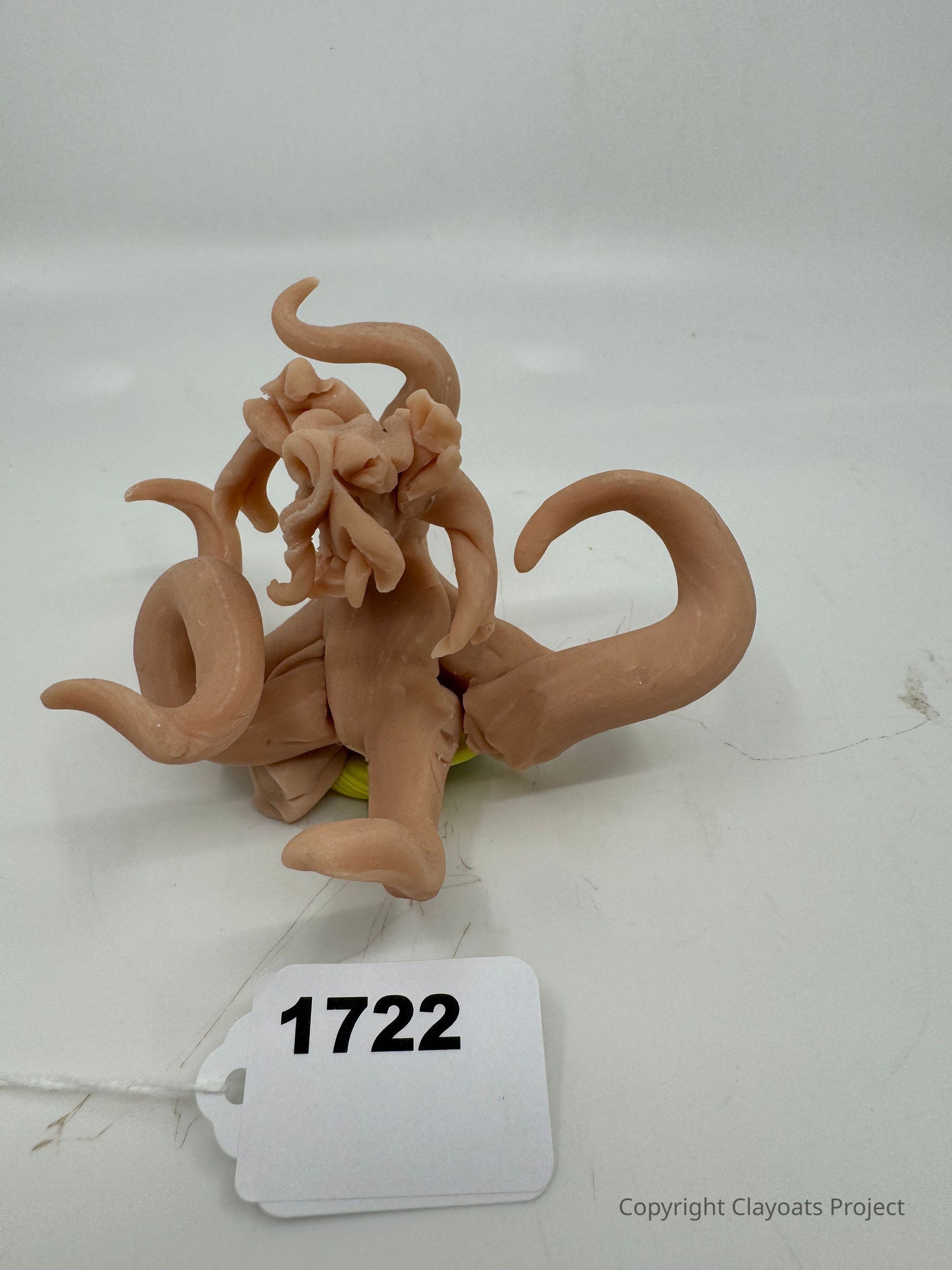 The image features a sculpture made of beige clay, depicting a whimsical creature with multiple swirling tentacles extending in various directions, and what appears to be a face obscured by draping shapes, all seated on a circular base. The creature exudes an air of playfulness and curiosity, with intricate details highlighting its imaginative design. The sculpture is placed on a light-colored surface.