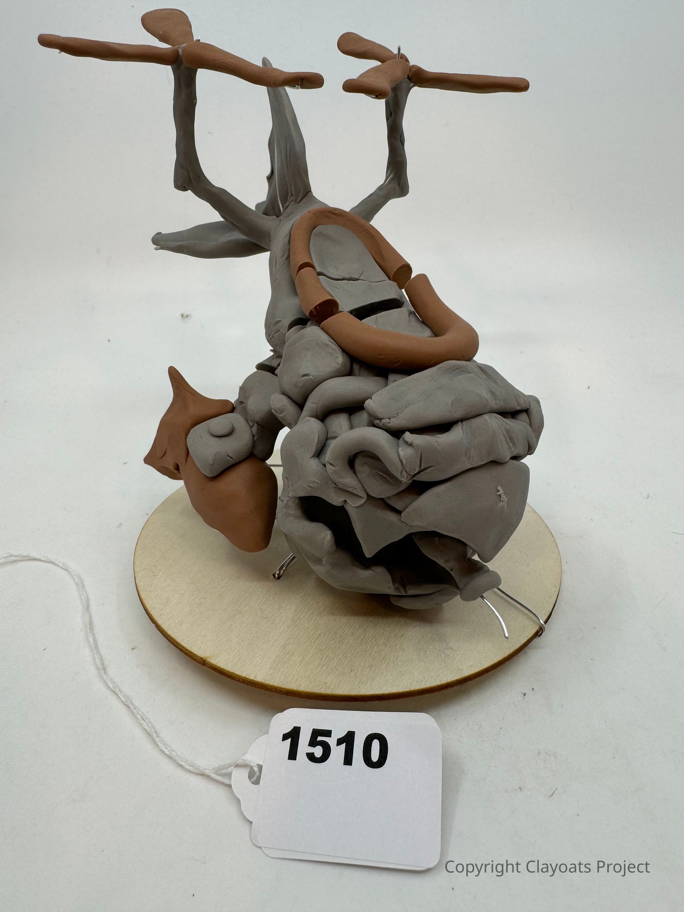 The image displays a creatively crafted sculpture made of clay, featuring a blend of gray and brown colors, shaped to resemble a whimsical, abstract form with upward-extending branches or appendages, and resting on a circular wooden base.