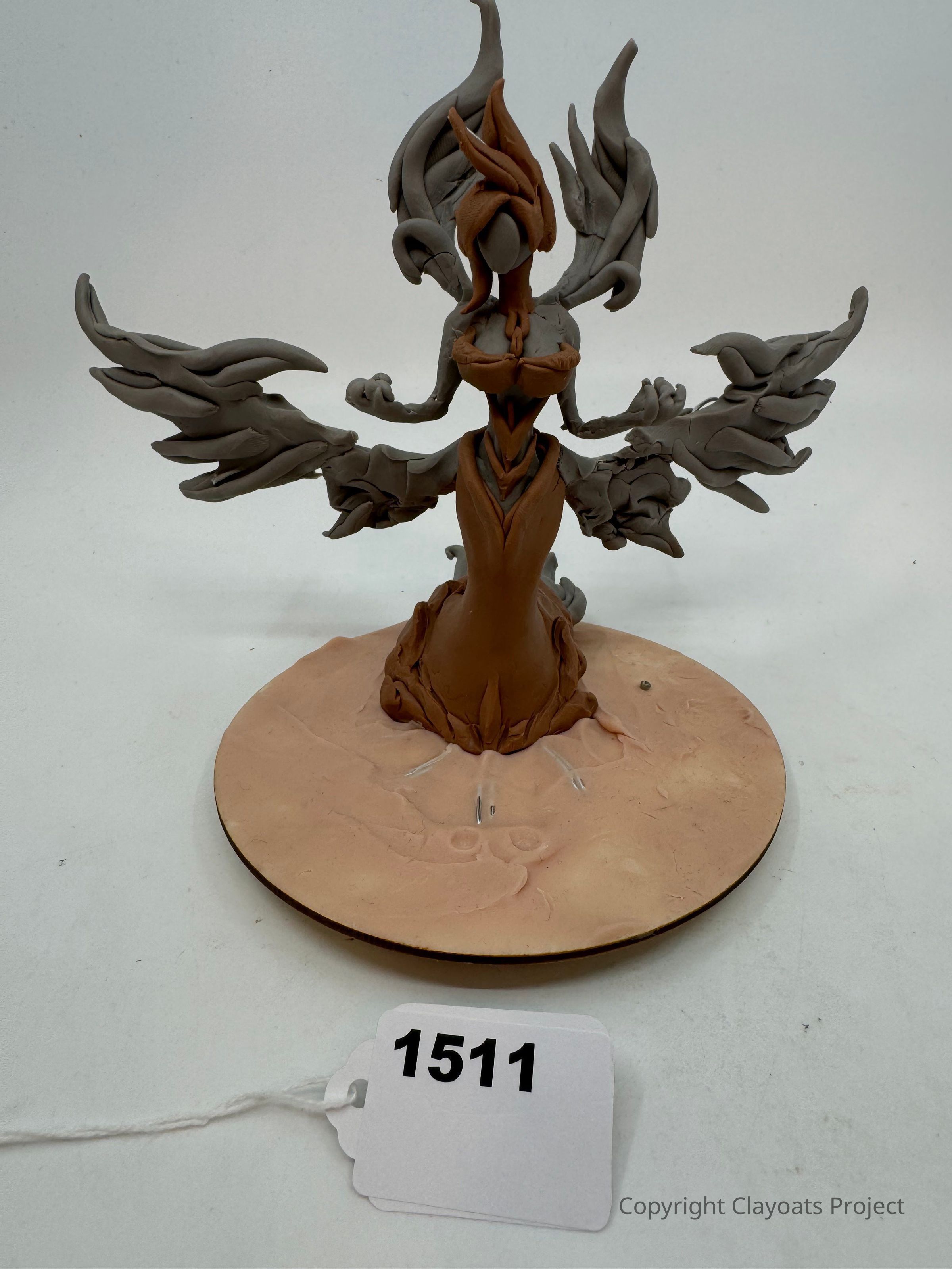 The image depicts a sculptural figure with an elongated and twisted form, resembling an abstract humanoid with flowing features, crafted from a material that appears to be either clay or a similar medium. The sculpture is primarily gray with brown accents, showcasing intricate and dynamic shapes that suggest movement or transformation. The figure stands on a circular base that has a subtle texture resembling sand or earth.