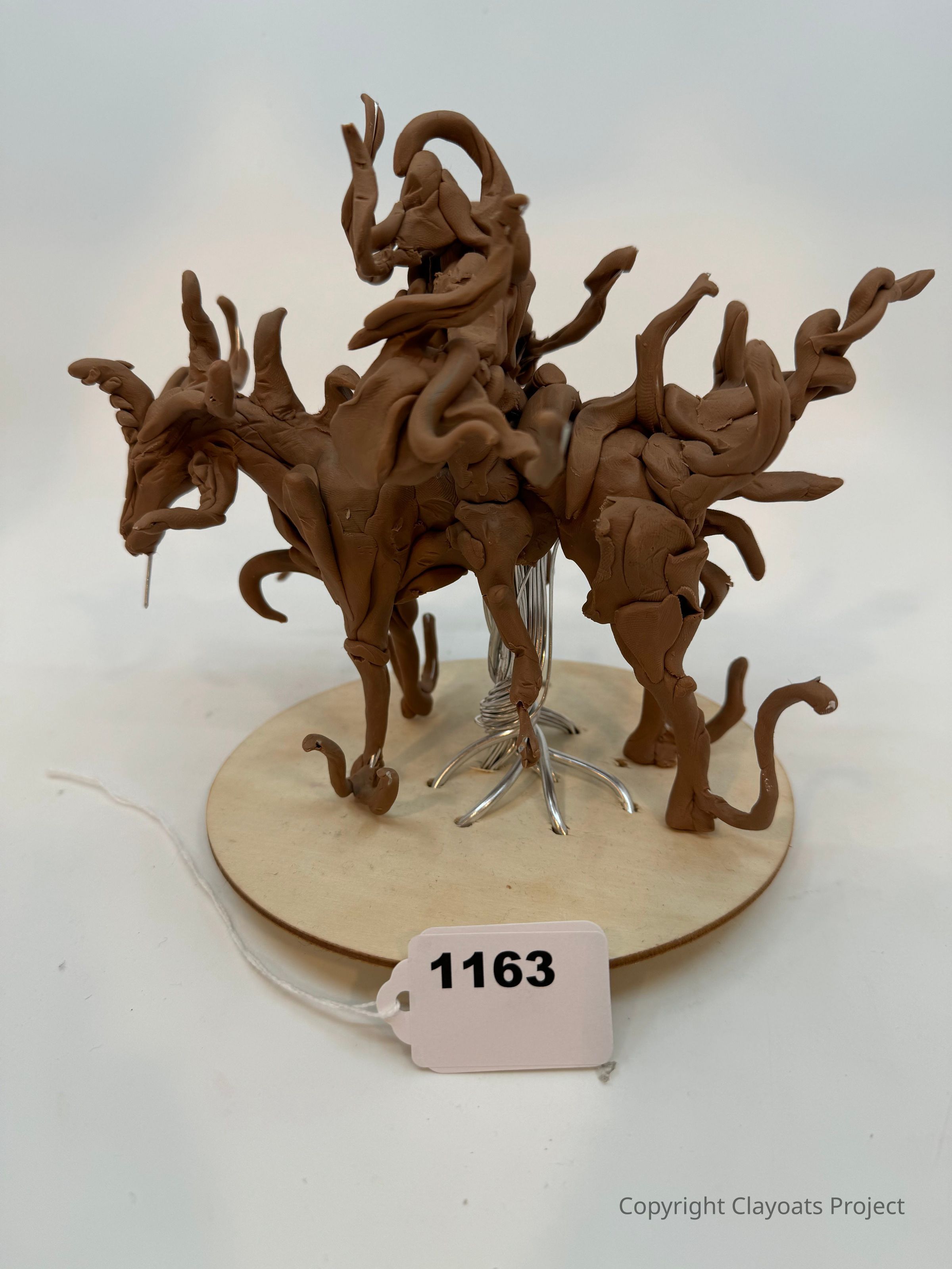 The image features a unique sculpture made from brown clay, depicting a fantastical creature with abstract, tentacle-like extensions and organic forms, mounted on a round wooden base. A delicate silver wire structure supports the sculpture, The creature appears to be dynamic and fluid, with twisting, spiraling limbs that give it a sense of motion and otherworldly presence. The overall composition blends creativity with an intricate attention