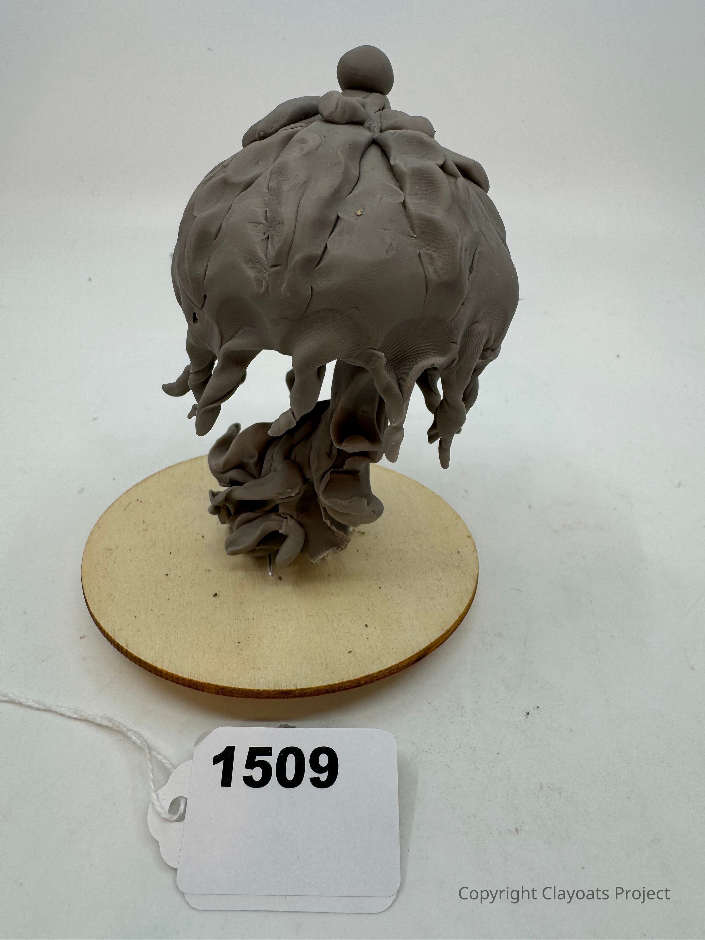 The image displays a unique gray clay sculpture resembling a jellyfish with an intricate, textured surface and flowing tentacle-like formations placed on a wooden base. The sculpture’s organic shapes give it a fluid, dynamic aesthetic, making it appear as if it could be swaying in an underwater current, adding a sense of movement