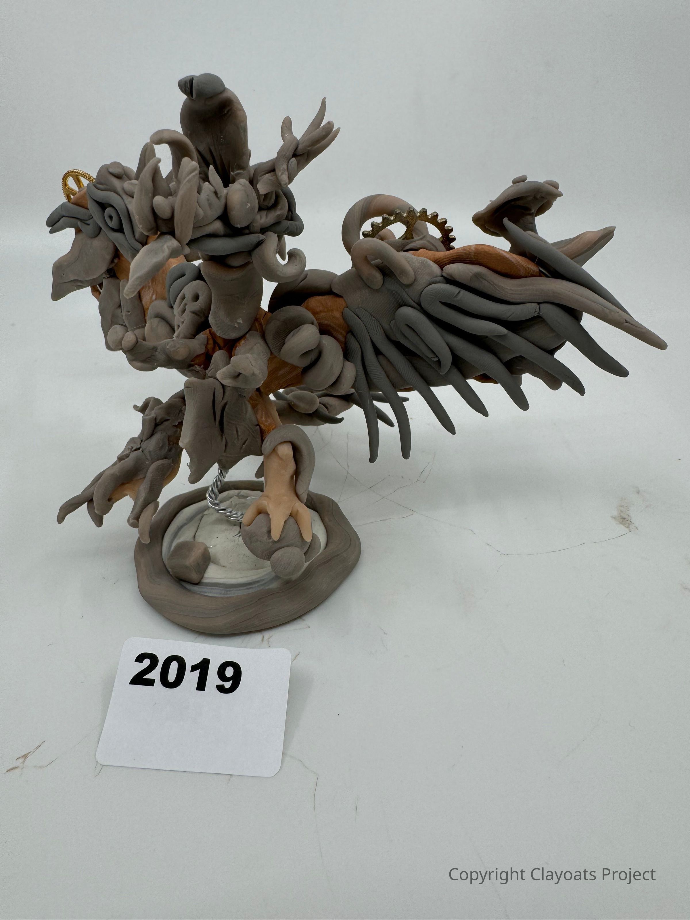 The image features a complex clay sculpture resembling a mythical creature with wings, claws, and a beak-like structure. The sculpture is intricately detailed, showcasing a variety of textures and forms, with elements that appear to be swirling around the main body. The use of muted earth tones adds depth and dimension to the piece, creating a sense of movement and fluidity. The sculpture is mounted on a circular base, and a small sign reading "2019" is placed in front of it, suggesting the