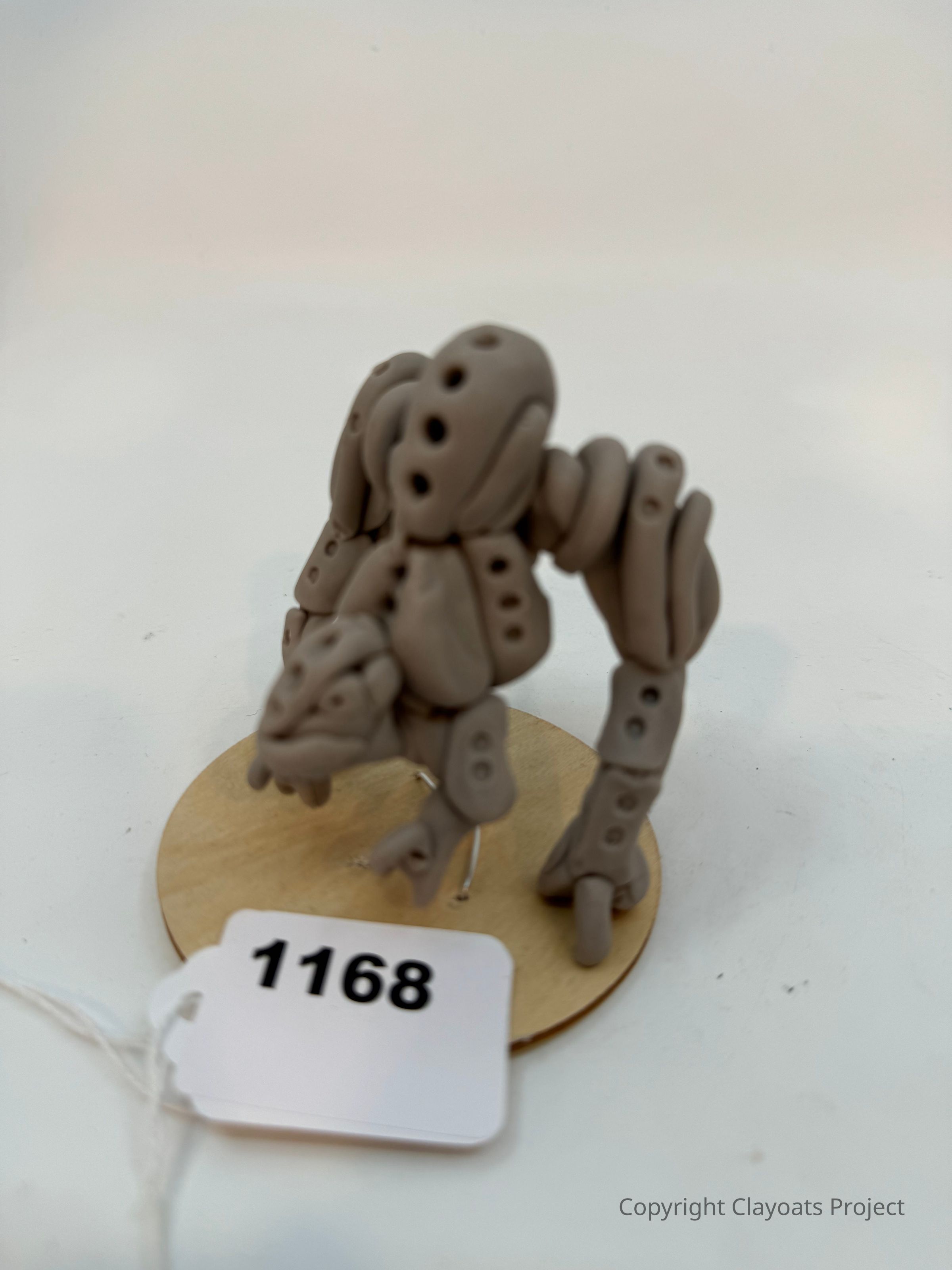 The image displays a small, intricately designed gray clay model resembling a robotic creature, featuring segmented limbs and a body with numerous holes, all poised on a circular wooden base; while the background remains unfocused to keep the attention on the uniquely artistic figure, emphasizing both the craftsmanship involved in its creation and its carefully balanced structure.