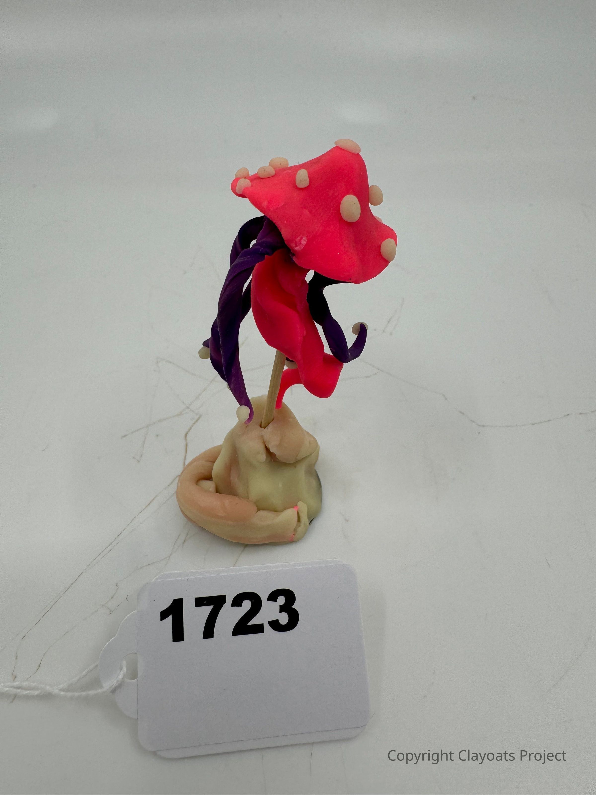 The image displays a small, colorful clay sculpture of a whimsical plant-like figure positioned against a plain white background; its vibrant red top is adorned with beige dots, and it features twisting purple and pink elements, resembling petals or vines, coiling elegantly upward from a rounded, beige base.