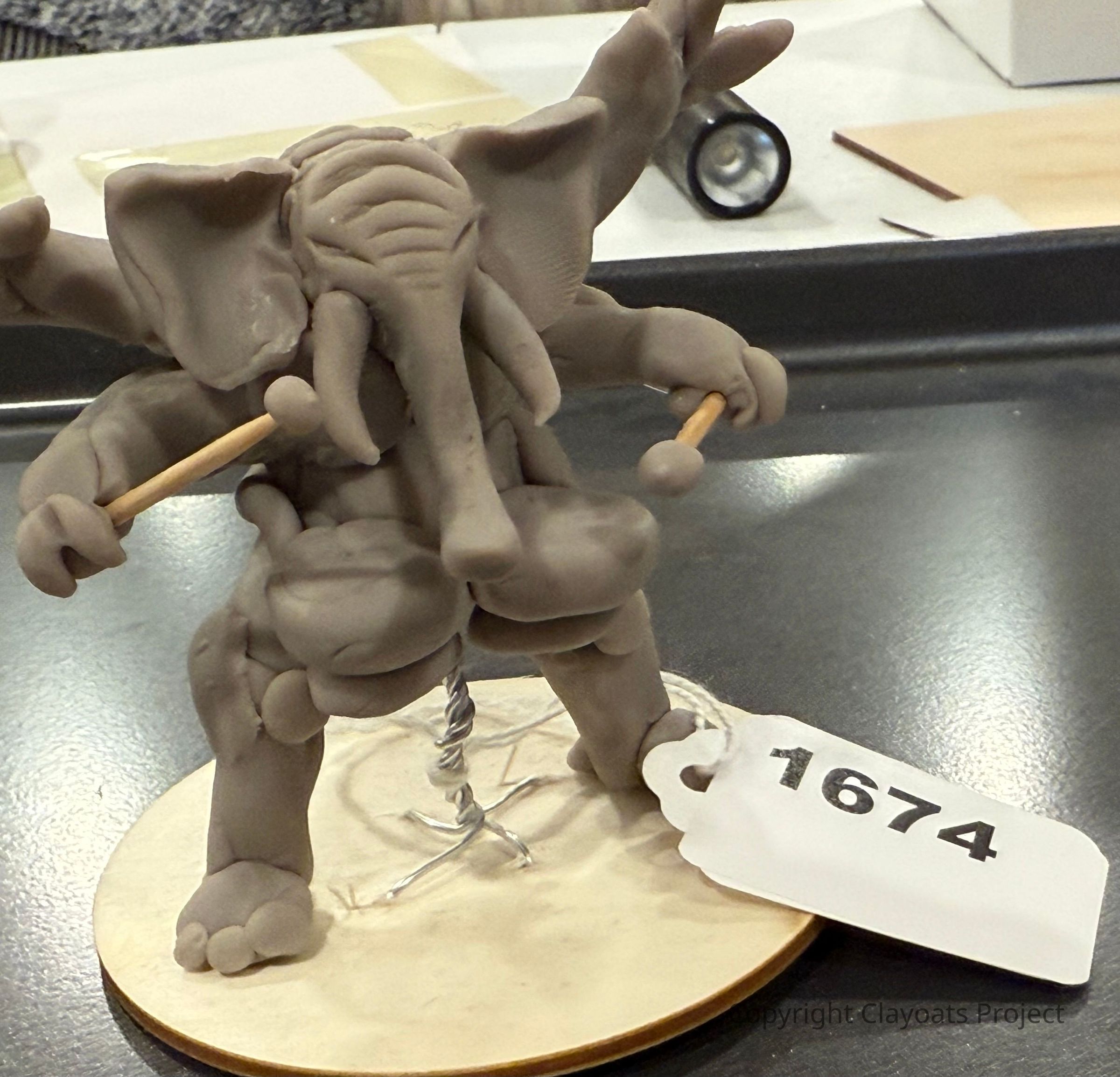 The image shows a clay sculpture of a multi-armed creature with an elephant's head, holding drumsticks in each hand. The sculpture stands on a circular base, with a visible wire structure extending from the base to support it. The detailed craftsmanship highlights the creature's wrinkled trunk, large ears, and dynamic pose.