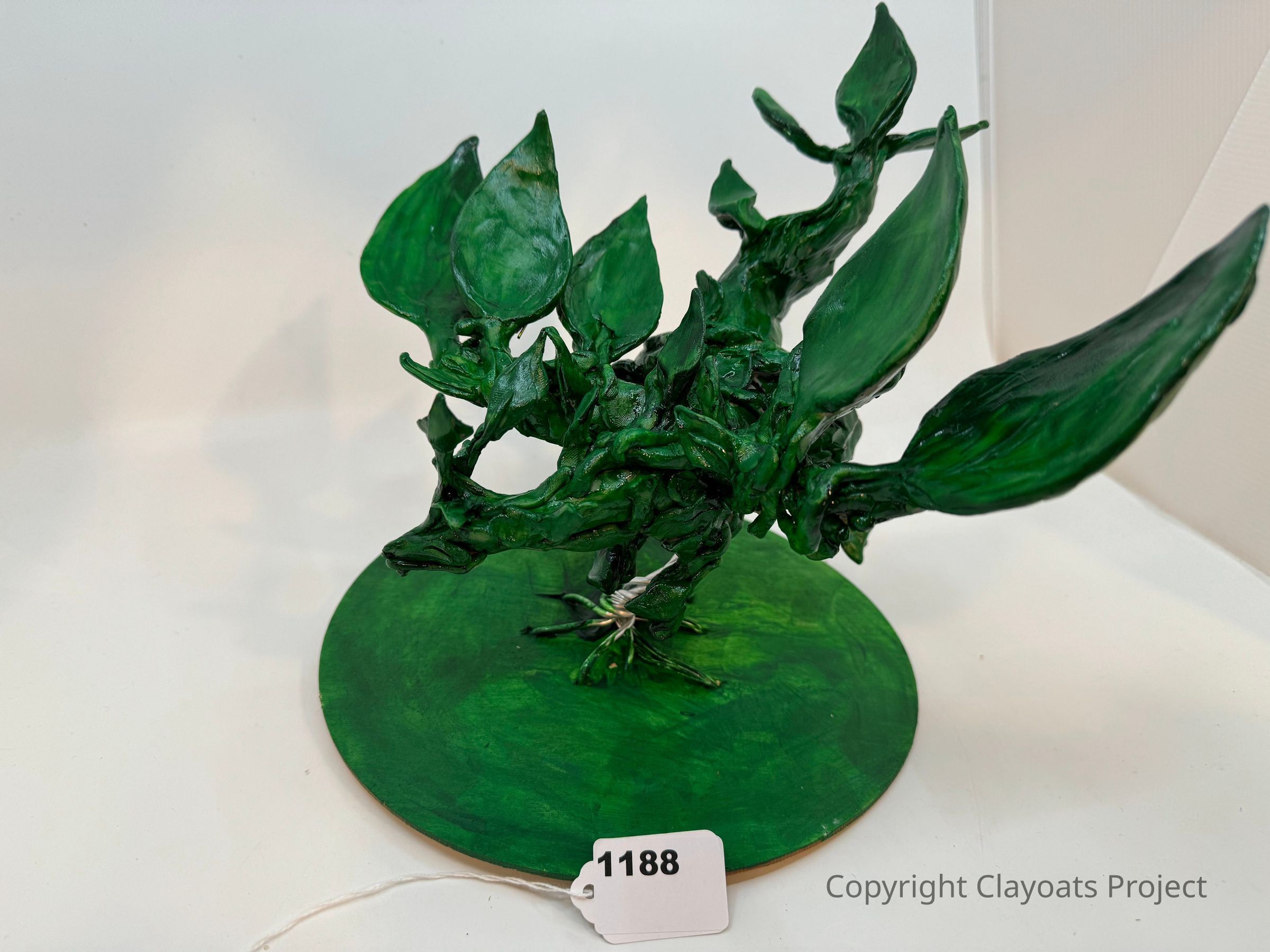 The image shows a green sculpture resembling a small tree or plant with multiple leaves and branches, intricately crafted with a shiny, smooth surface, set on a circular base matching the vibrant green color of the sculpture, all against a plain beige background.