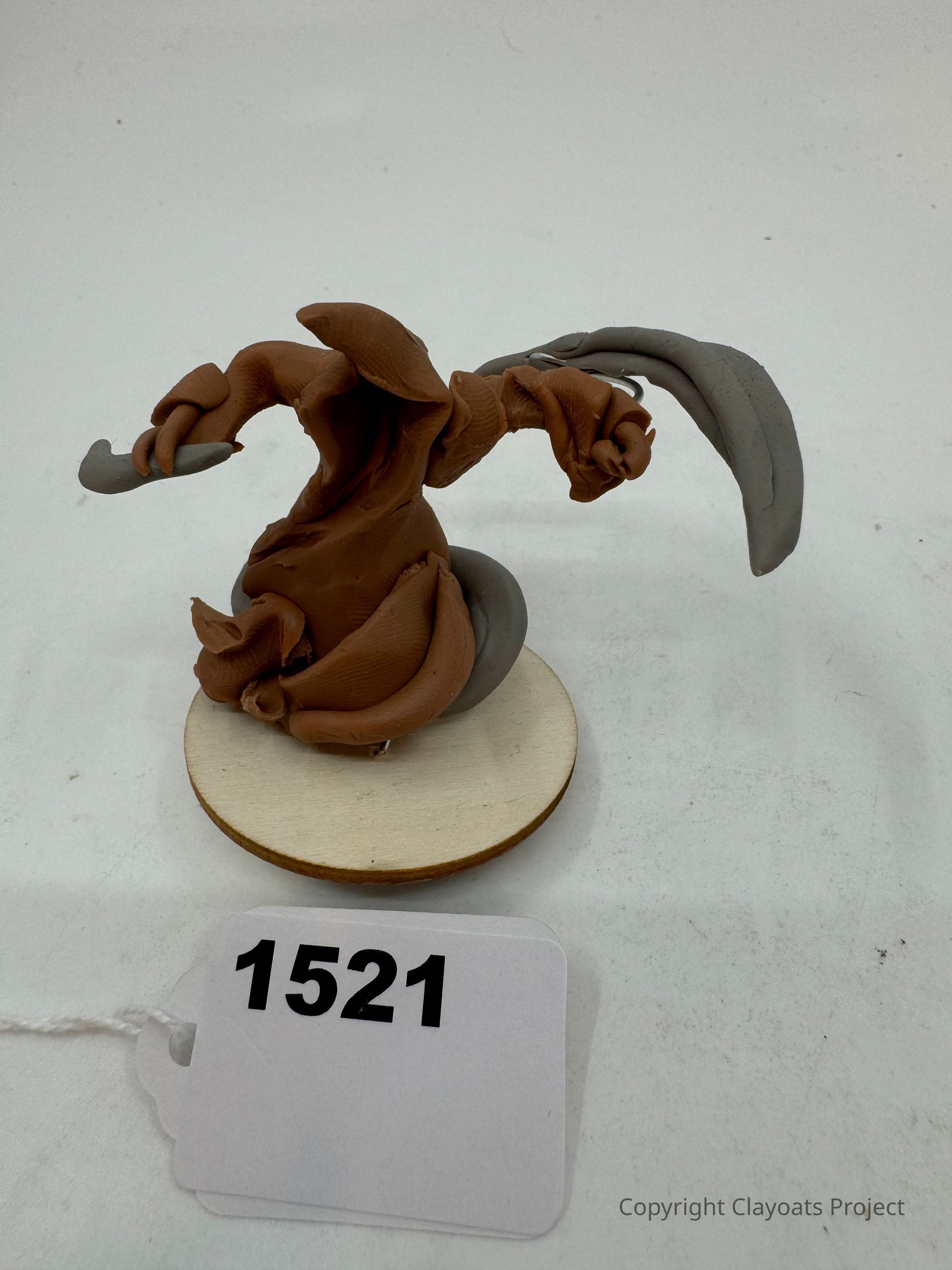The image features a brown and gray abstract clay sculpture with twisting forms mounted on a round wooden base against a plain white background, creating an intriguing mix of organic and flowing shapes, which might resemble a dynamic, imaginative creature in motion or a unique artistic representation, as the earthy tones and smooth texture contrast subtly with the stark simplicity of the environment, invoking curiosity about its creative intention, while the number tag suggests cataloging in a