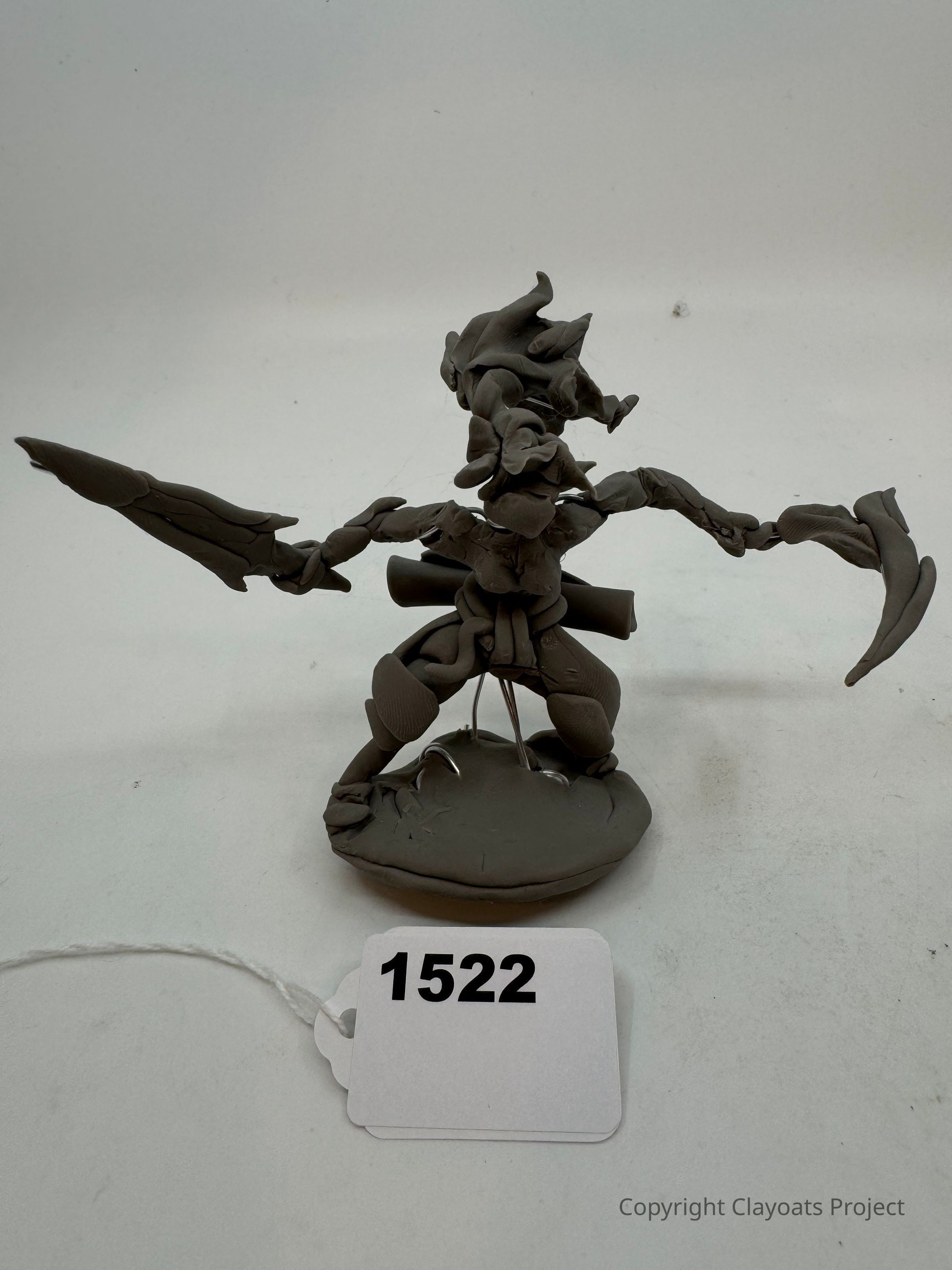 The image shows a clay sculpture of a dynamic, stylized figure with elongated limbs and abstract features, standing on a base with a wire support. The figure holds a pointed staff or weapon in one hand and has angular, flowing elements that suggest movement or action. . The background is a neutral gray, allowing the details and textures of the sculpture to stand out clearly against the monochromatic