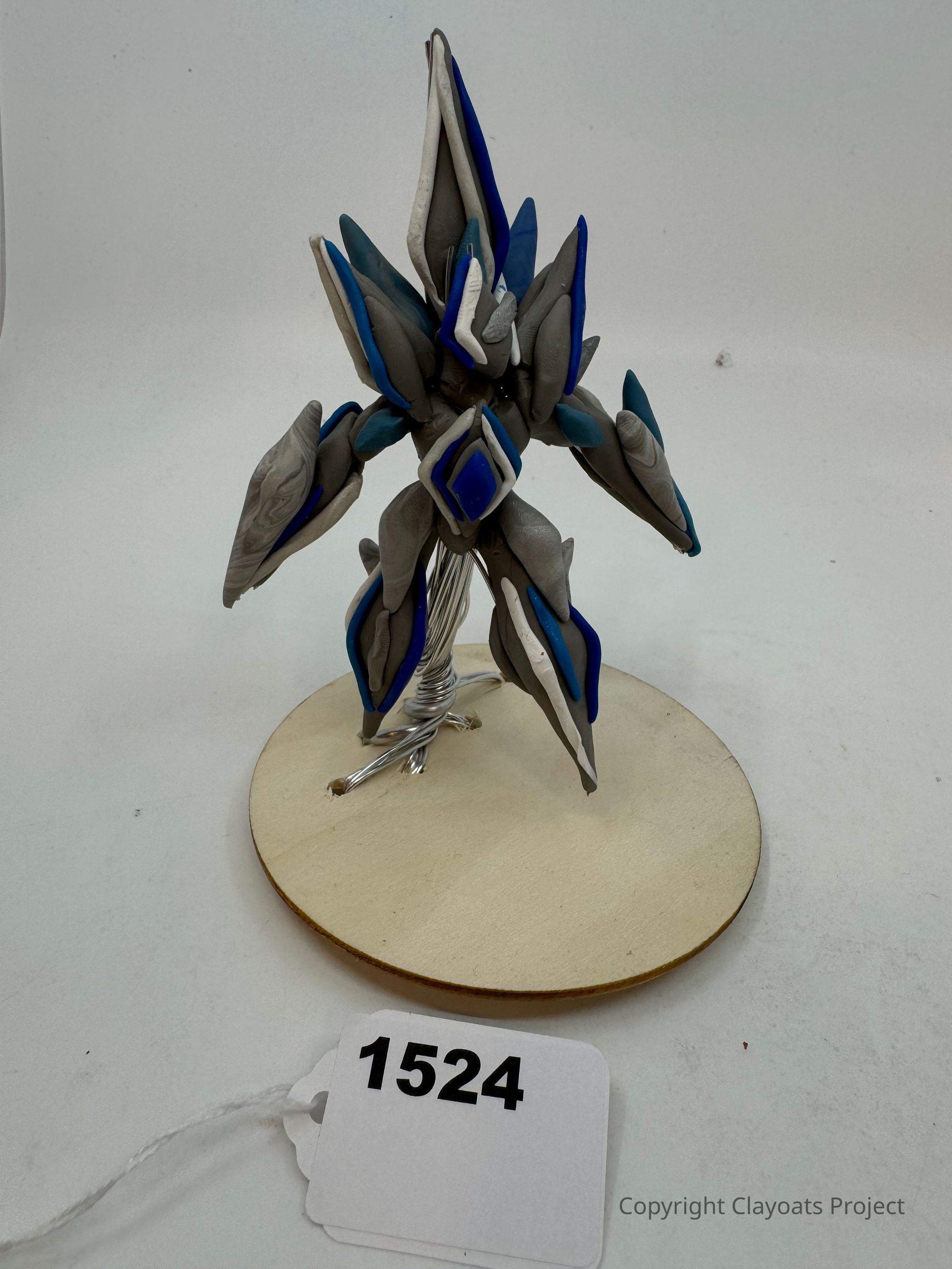 The image features a sculptural creation resembling a futuristic or alien-like figure crafted from clay or similar material, primarily in shades of gray with striking blue accents at various points, standing on a round wooden base. The figure seems to have a symmetrical design with pointed, leaf-like protrusions extending outward, giving it a dynamic and complex appearance. It is supported by a visible wire structure that might also suggest a sense of movement or balance.