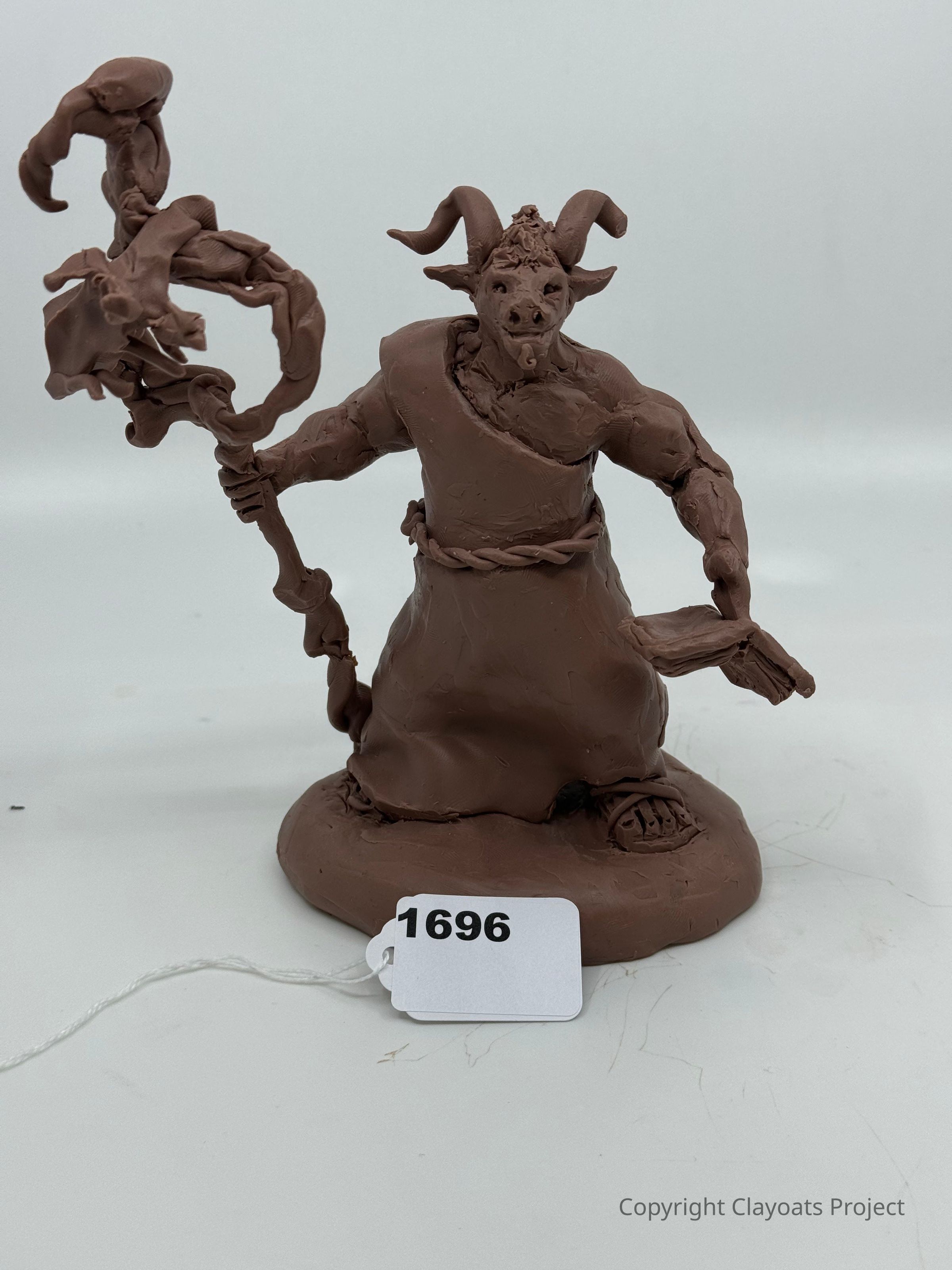 The image shows a brown clay sculpture of a mythological creature with goat-like horns, a humanoid body, and a detailed, textured face holding a large, ornate staff in one hand and what appears to be a book or tablet in the other hand; the figure stands on a rounded base, with a tag labeled "1696" attached by a string in front of the sculpture, all set against a plain white background, highlighting the intricate details and imaginative design of the artwork.