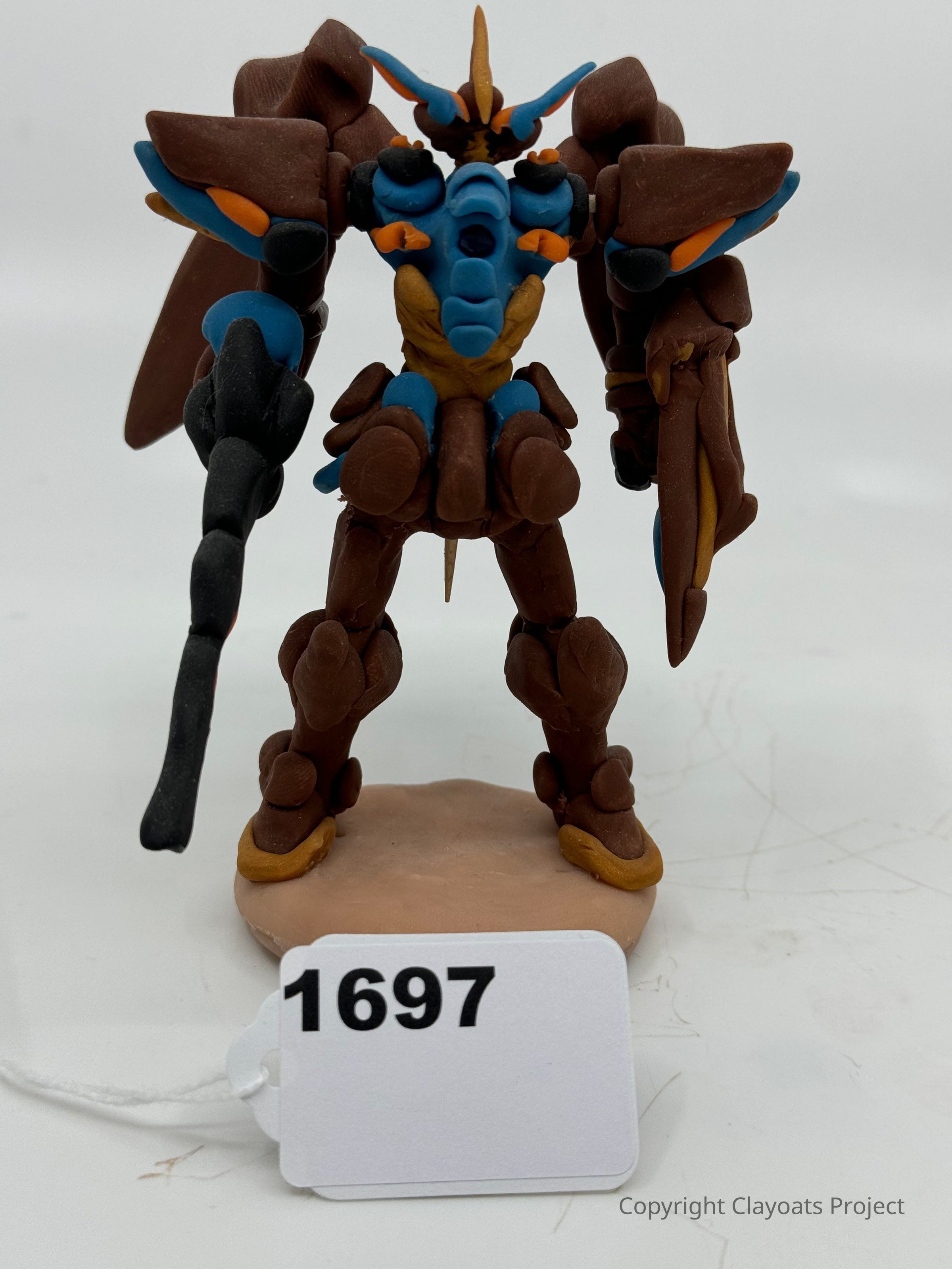 The image depicts a model or sculpture resembling a futuristic robot or mech, crafted in brown, blue, black, and yellow colors, standing on a beige base. The figure has an intricately designed body with a humanoid shape, featuring angular and segmented armor-like plating that gives it an insect-like appearance. The robot's head is adorned with horn-like structures, and its limbs are articulated with multiple joints, suggesting a blend of organic and mechanical elements.