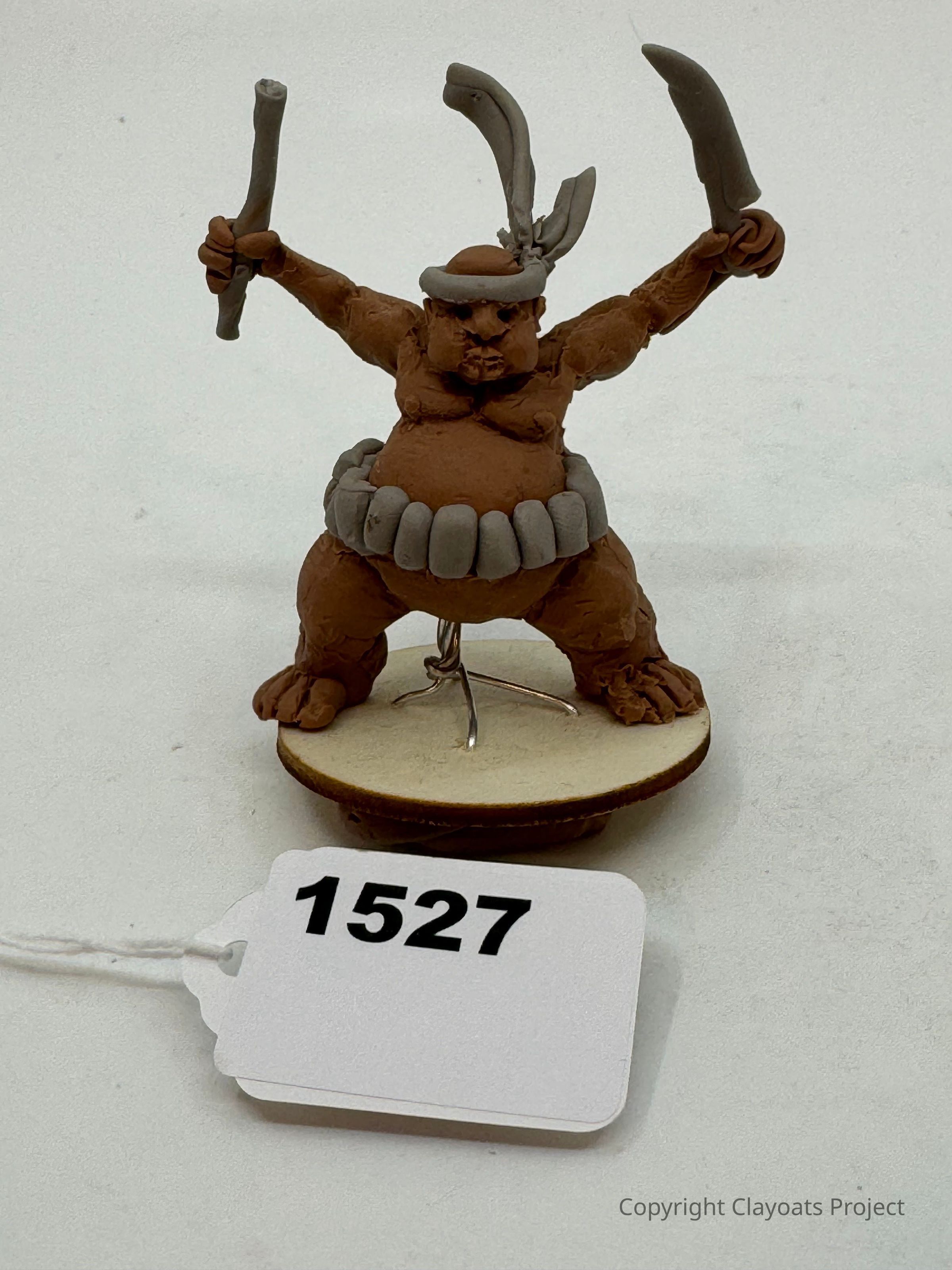 The image displays a clay figurine of a robust warrior with two raised weapons, adorned with a headband and decorative feathers. The figure stands on a circular base, and it features a detailed belt around its waist. The warrior's dynamic pose conveys a sense of action or triumph, with both arms stretched upwards, capturing a moment of victory or confrontation. The earthy color tones of the clay
