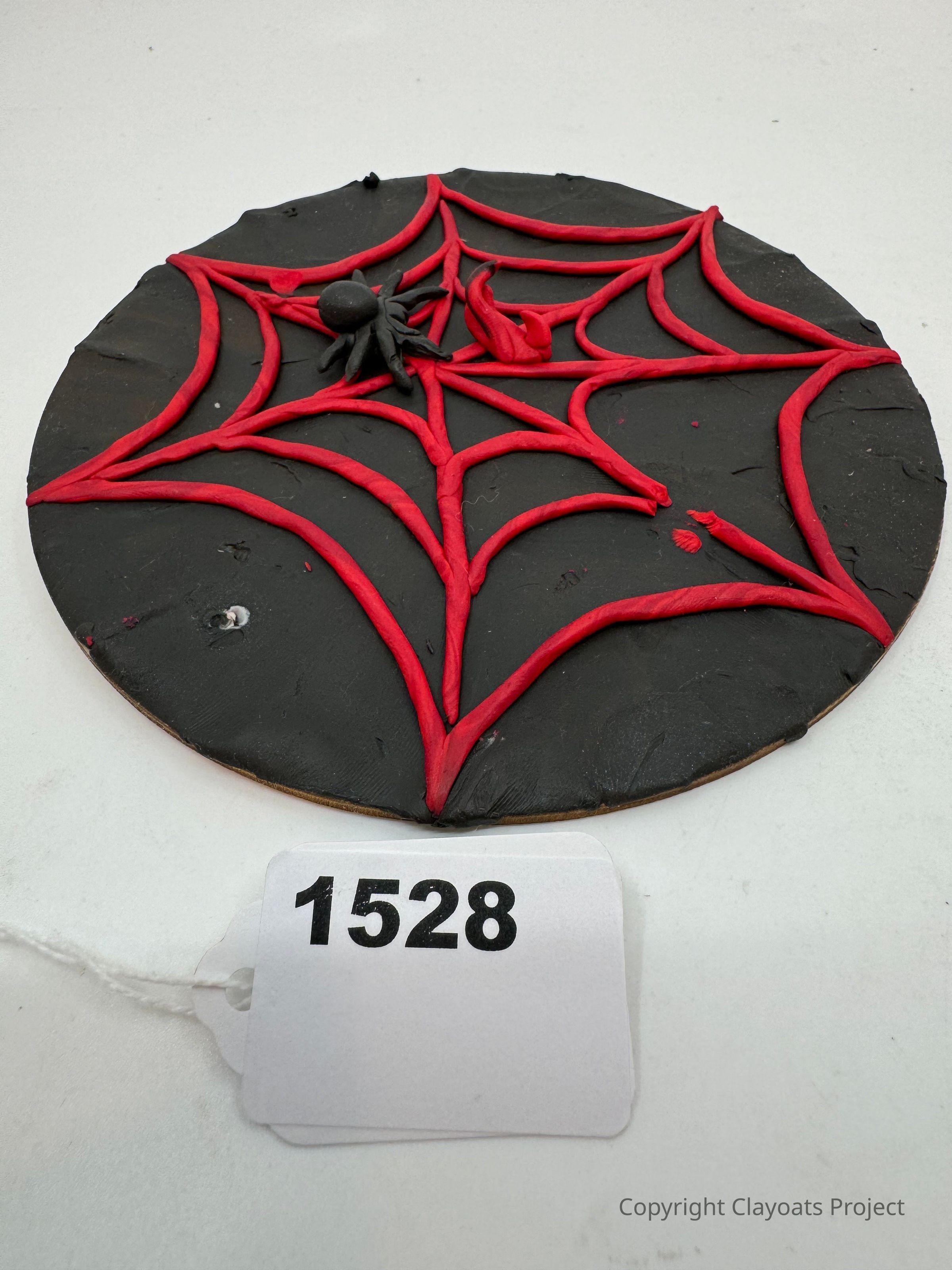 The image shows a round, black disc decorated with a red spider web design created in relief. In the center of the web, there's a small black spider also crafted in relief. The intricate red web strands create a striking contrast against the dark background. The setup appears to be on a plain, white surface, emphasizing the bold colors and design of the decorative disc. The piece exhibits a