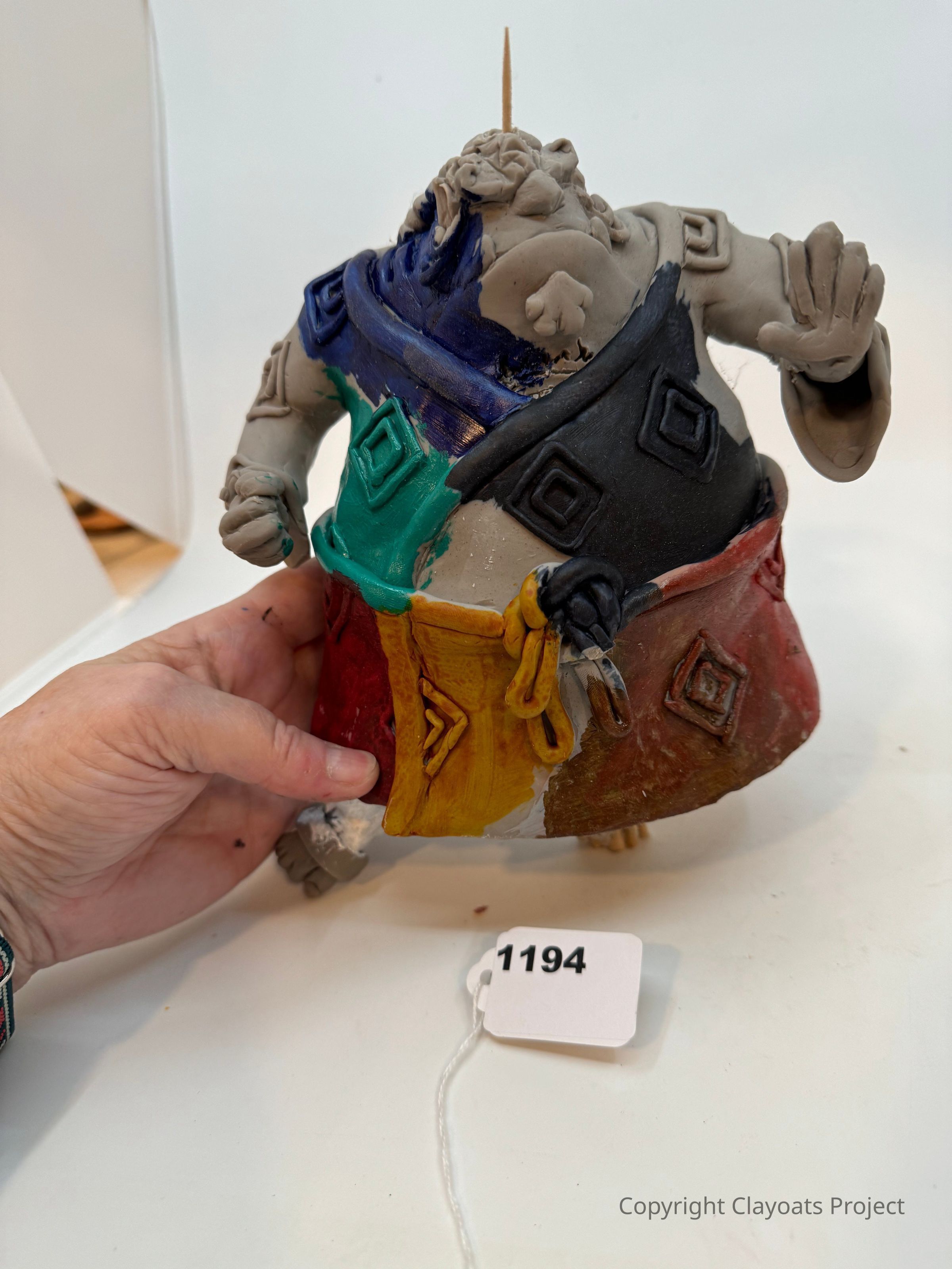 The image shows a hand holding a colorful, handmade clay sculpture of a rotund figure with a distinct posture, wearing a multicolored garment that incorporates shades of blue, green, black, red, and yellow. The sculpture appears unfinished, particularly at the head, with a toothpick protruding from the top. The figure's design includes geometric patterns and stylized details.