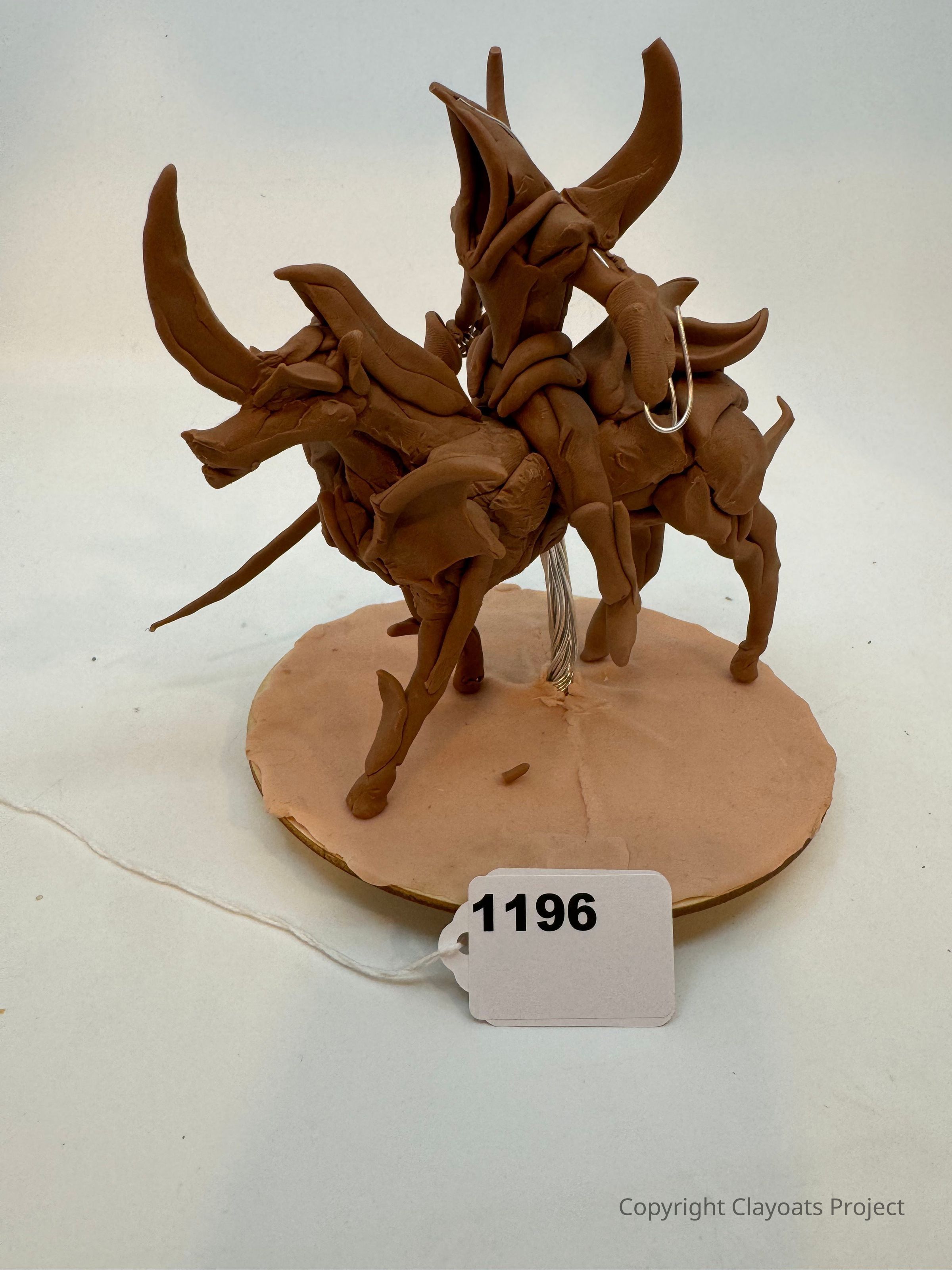 The image shows a unique sculpture crafted from clay-like material, featuring abstract forms resembling animals with elongated, horn-like structures on their heads. The figures are intricately stacked on a round base, with visible details such as their limbs and expressive body shapes. The earthy tone of the clay adds an organic feel to the artwork, highlighting the creativity and craftsmanship involved in sculpting such imaginative, dynamic
