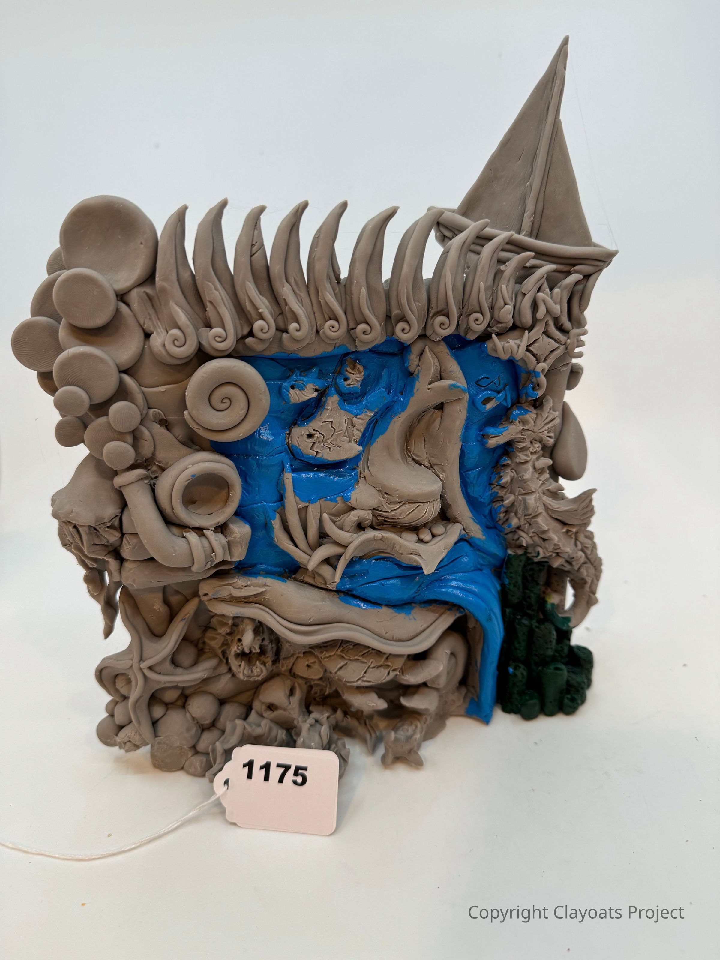 The image showcases an intricate, abstract clay sculpture with a variety of swirling patterns, geometric shapes, and organic textures, resembling elements of nature and fantasy, featuring a bold blue section in the center surrounded by predominantly gray material. On the left side, circular and spiral motifs create a sense of movement and rhythm, while the right side is dominated by a tall, pointed structure that suggests a castle or tower. At the base, the sculpture incorporates diverse textures and forms, including what appear to be star-like shapes