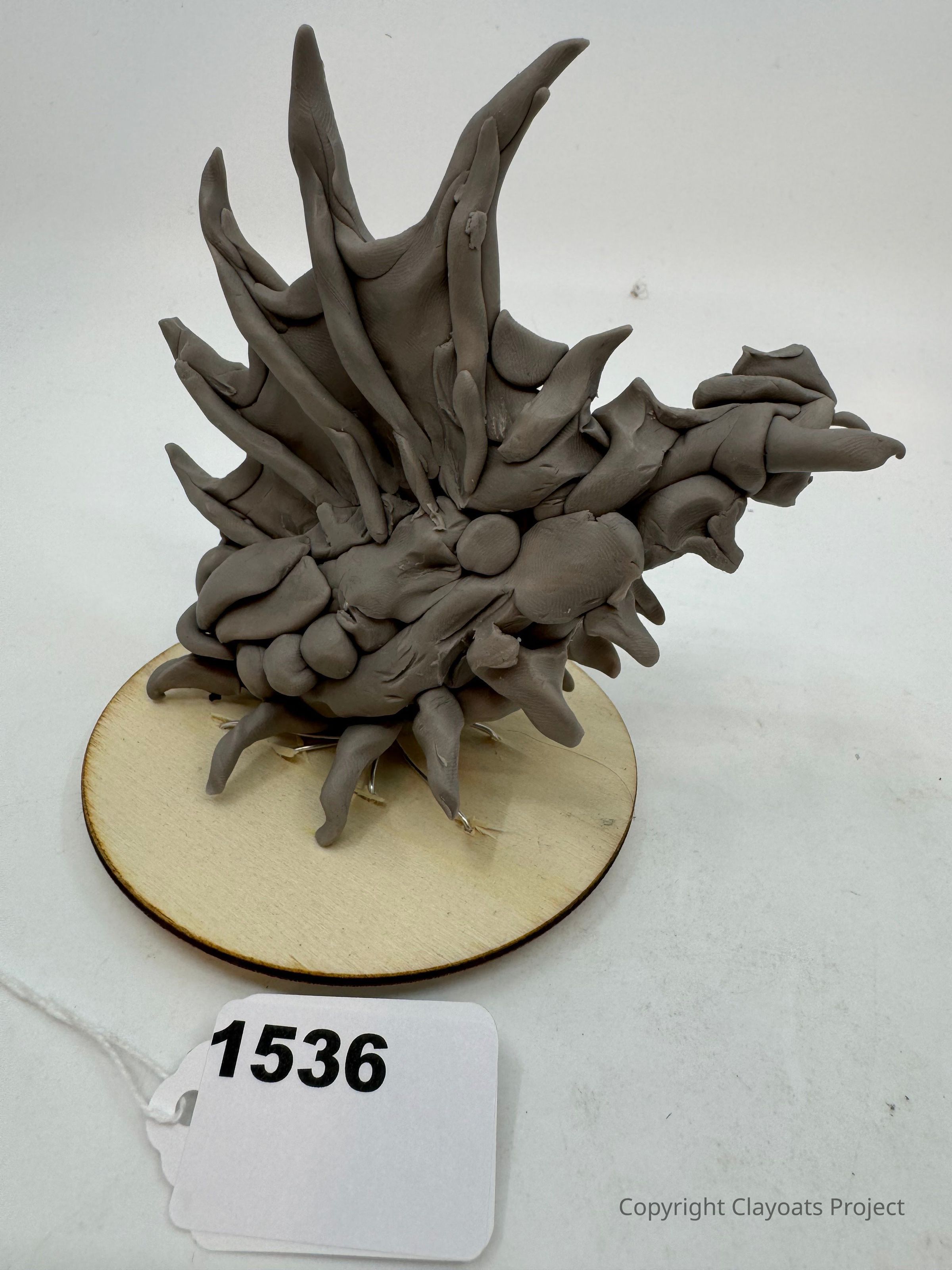 The image features a sculptural creation made of clay, characterized by elongated, jagged spikes that extend outward in various directions from a rounded base. This clay formation rests on a circular wooden platform, giving it a stable foundation. The entire sculpture has a rough texture, emphasizing the raw, organic feel of the piece. The background is a plain white, highlighting the intricate details and complex structure of the clay artwork, which