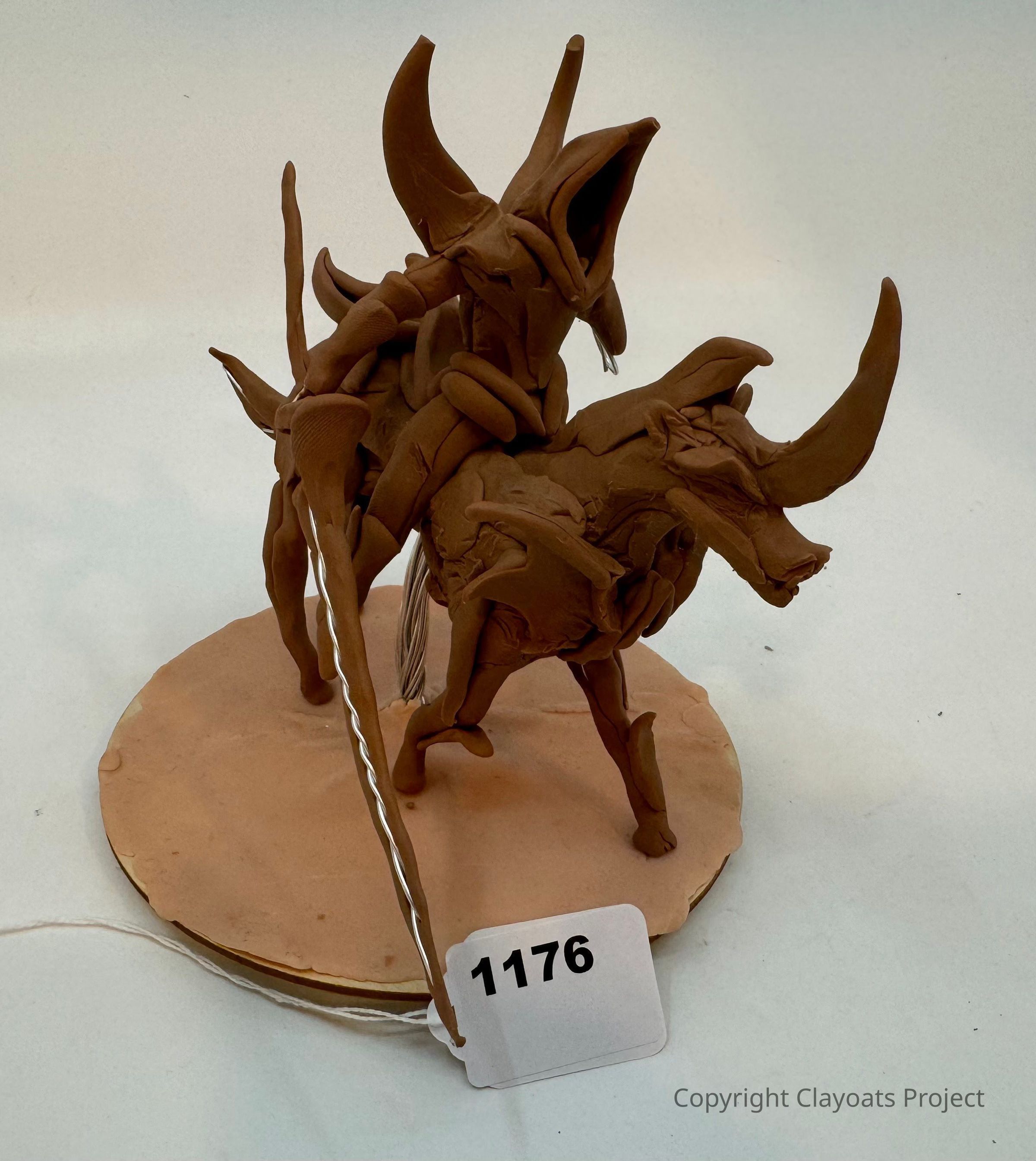 The image shows a sculptural artwork made of brown clay, depicting a creature with two large horns riding on the back of an animal-like figure with prominent features. The sculpture is mounted on a round base, which is placed on a flat surface. A wire coil extends from the piece. The forms are abstract, with dynamic poses suggesting motion or interaction between the figures. The overall scene conveys a sense of creativity, blending elements of fantasy and realism through expressive