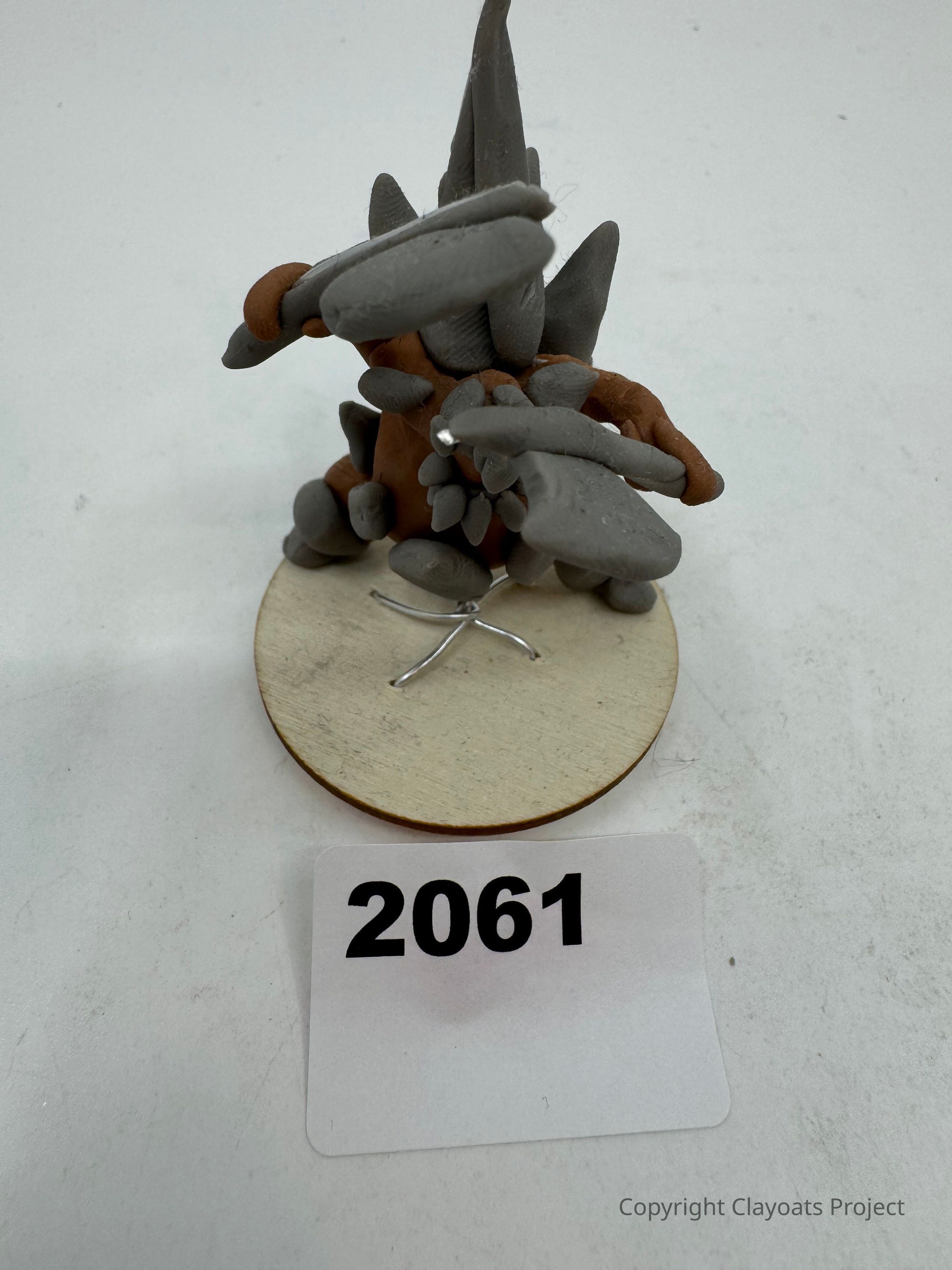 The image shows an abstract clay sculpture featuring various brown and gray shapes arranged in a complex, spiky formation on a circular base, with a small wire stand protruding beneath.