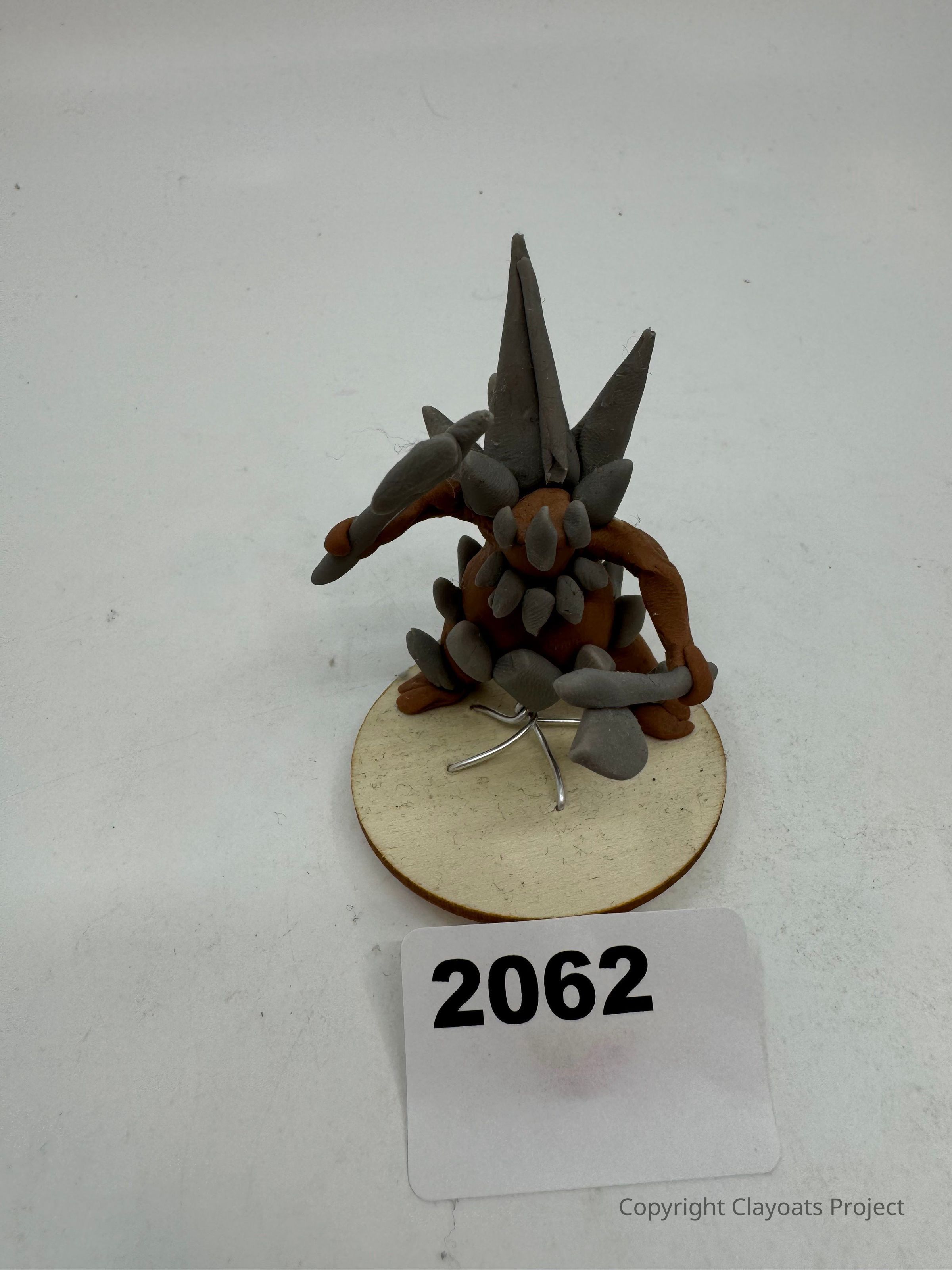 The image features an abstract sculpture made from clay, displaying a variety of pointed and rounded shapes with gray and brown tones, artfully arranged on a circular wooden base. In front of the sculpture. The sculpture's unique form invites interpretation, prompting viewers to consider its possible meanings or inspirations, while the simple background ensures full focus remains on the artistic creation and its