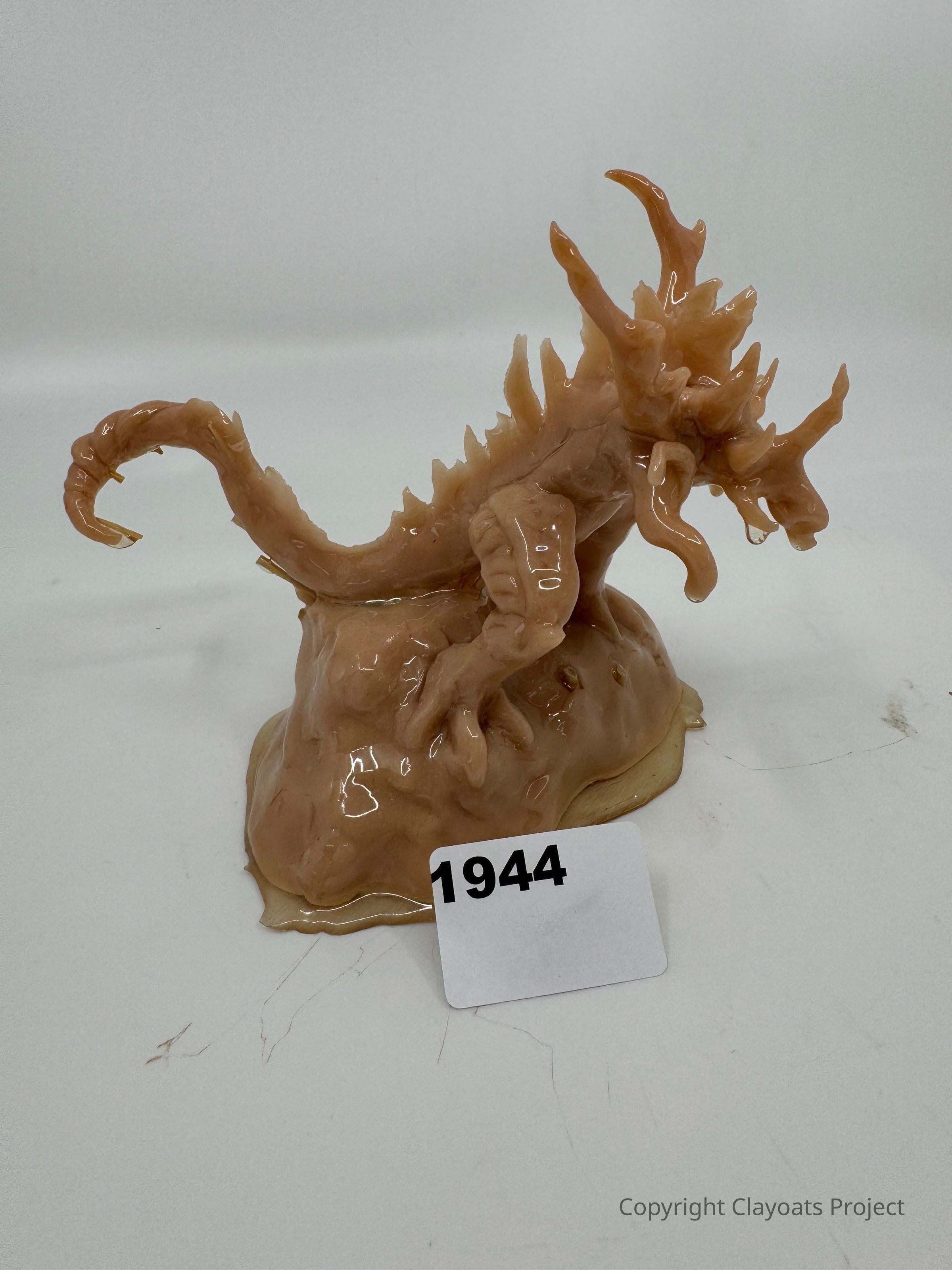 The image features a detailed, sculpted figure resembling a dragon made from a glossy, brownish material, displaying intricate spikes and curled tail, resting atop a smooth, rounded base; placed on a flat surface.