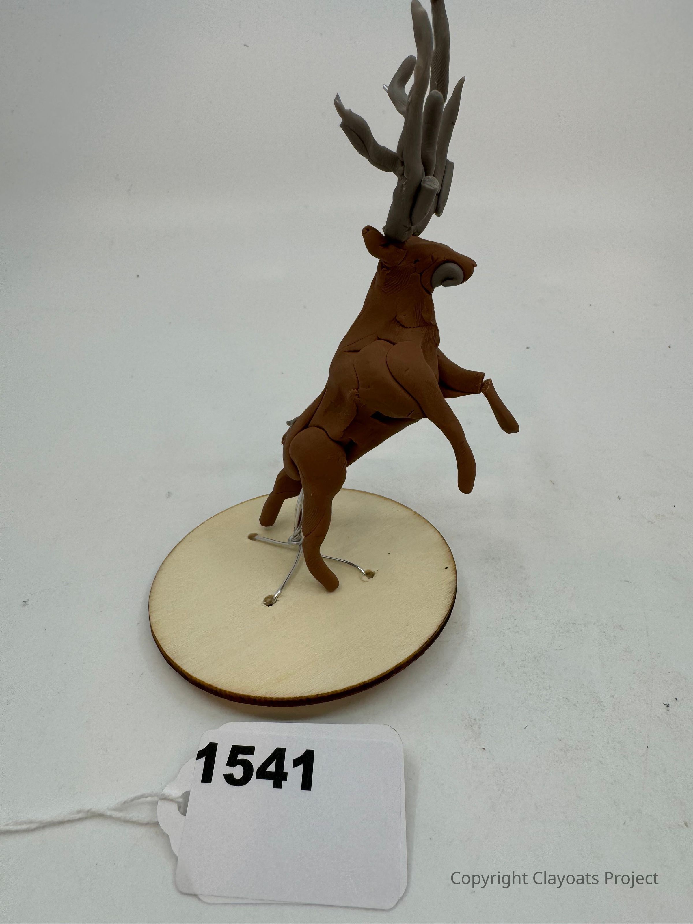 The image depicts a small clay model of a rearing deer with exaggeratedly large and twisting antlers, mounted on a circular wooden base. The deer is crafted with brown clay for its body and gray clay for the antlers. It is supported by thin wire around its legs to maintain its upright position. The background is a neutral, light-colored surface,