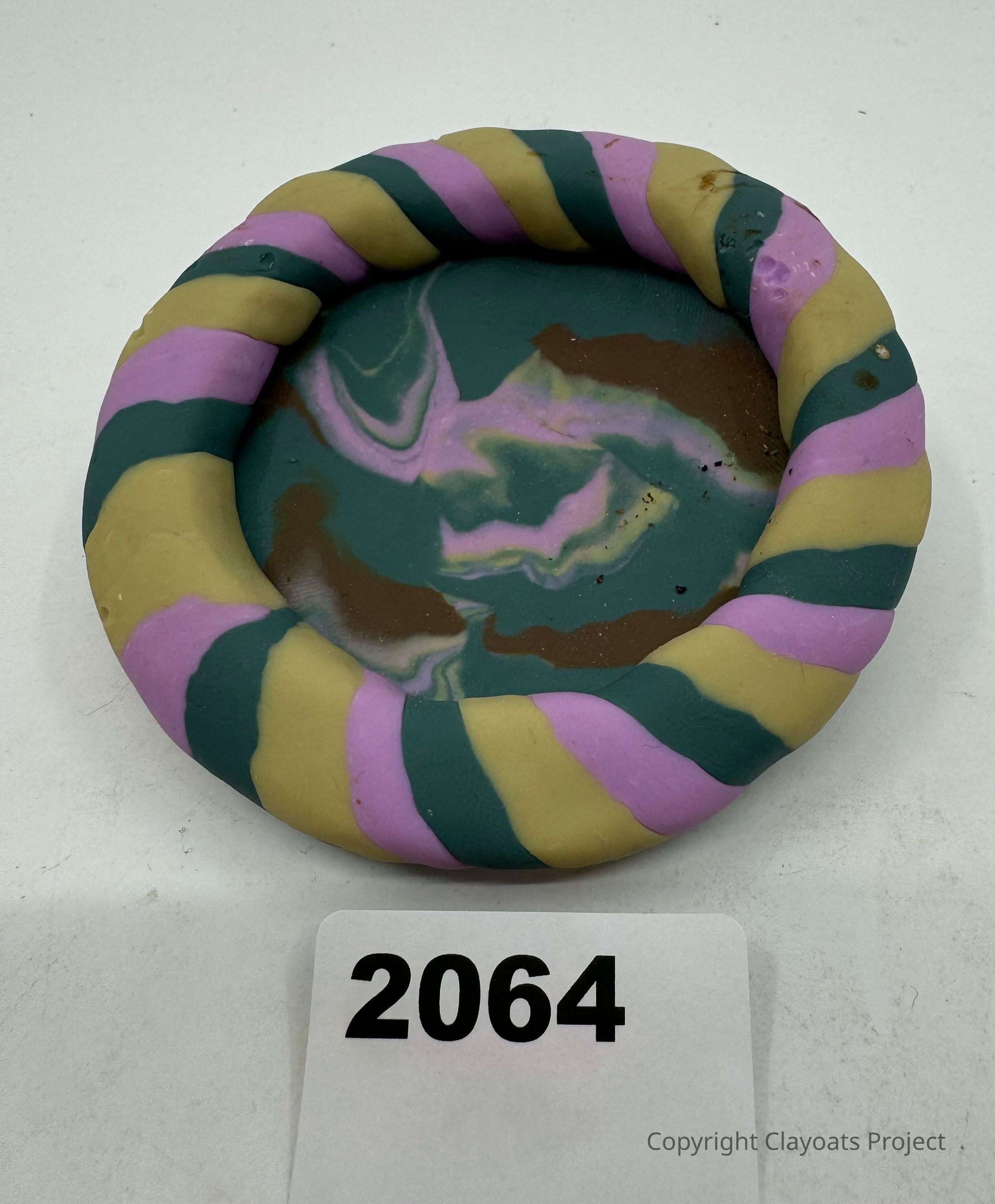 The image shows a circular, handcrafted object resembling a shallow dish or plate, featuring a swirled pattern of green, brown, and purplish-pink colors in the center, surrounded by a thick, twisted rim alternating in mustard yellow, dark green, and purple. The dish appears to be made of a clay-like material, and the multicolored design