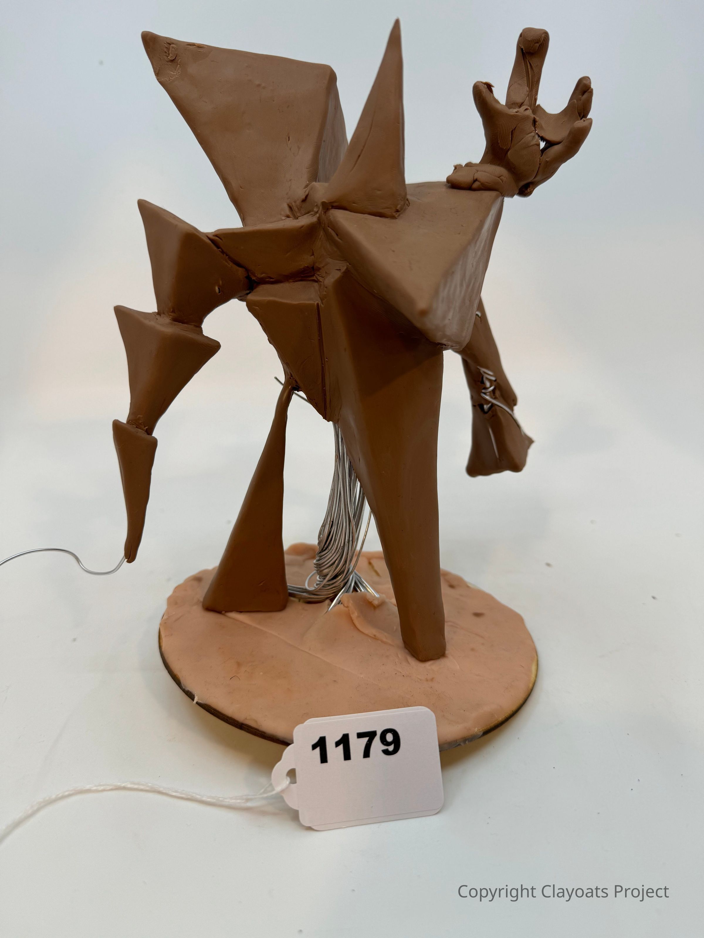 The image shows an abstract clay sculpture with angular shapes and protrusions, resembling a creature with limbs and pointed extensions, standing on a circular base; wires protrude from its body, adding a dynamic element suggesting it might be part of an exhibition or collection.