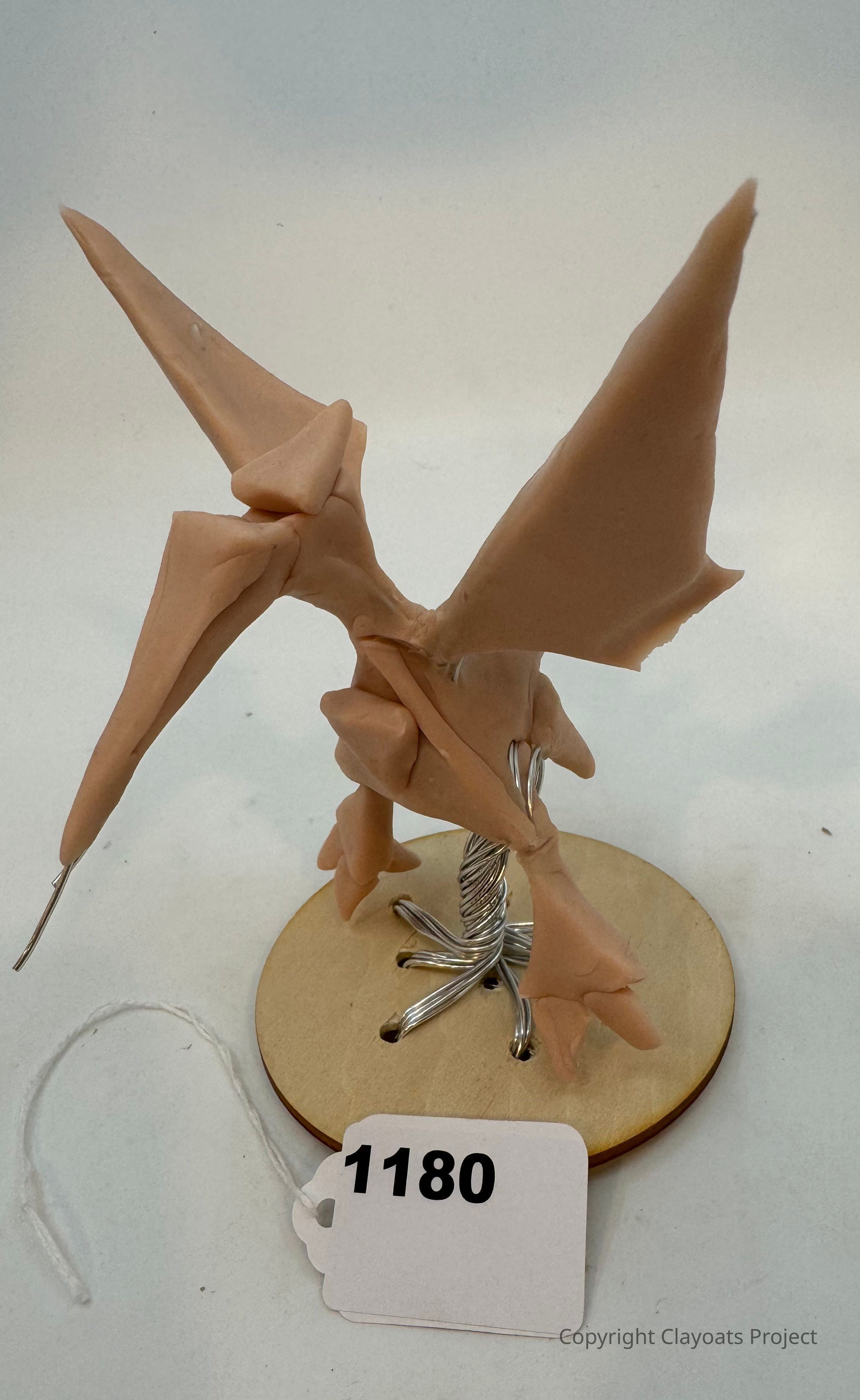 The image depicts a sculpted figure resembling a pterosaur, created from a pink modeling material with exaggerated features such as large, pointed wings and a long, slender beak, mounted on a wooden base supported by twisted wire for stability, reflecting both artistic craftsmanship and imaginative representation of prehistoric creatures in a minimalistic design that captures the essence of ancient winged reptiles, engaging viewers.