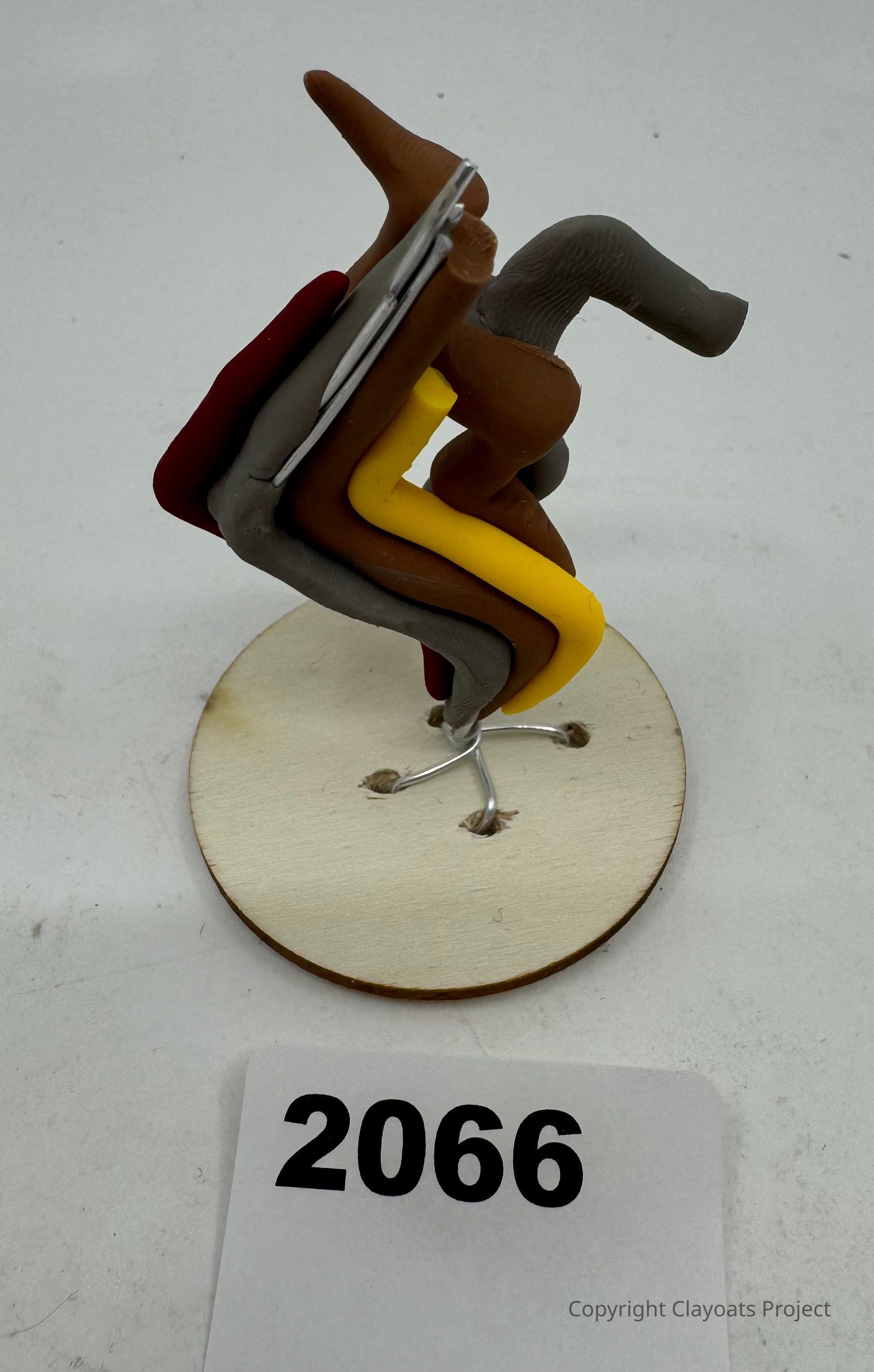 The image features a sculptural object with colorful twisted clay pieces, including shades of brown, red, gray, and yellow, supported by metal wire anchored into a round wooden base; it appears to be an abstract piece of art, placed on a plain white surface.