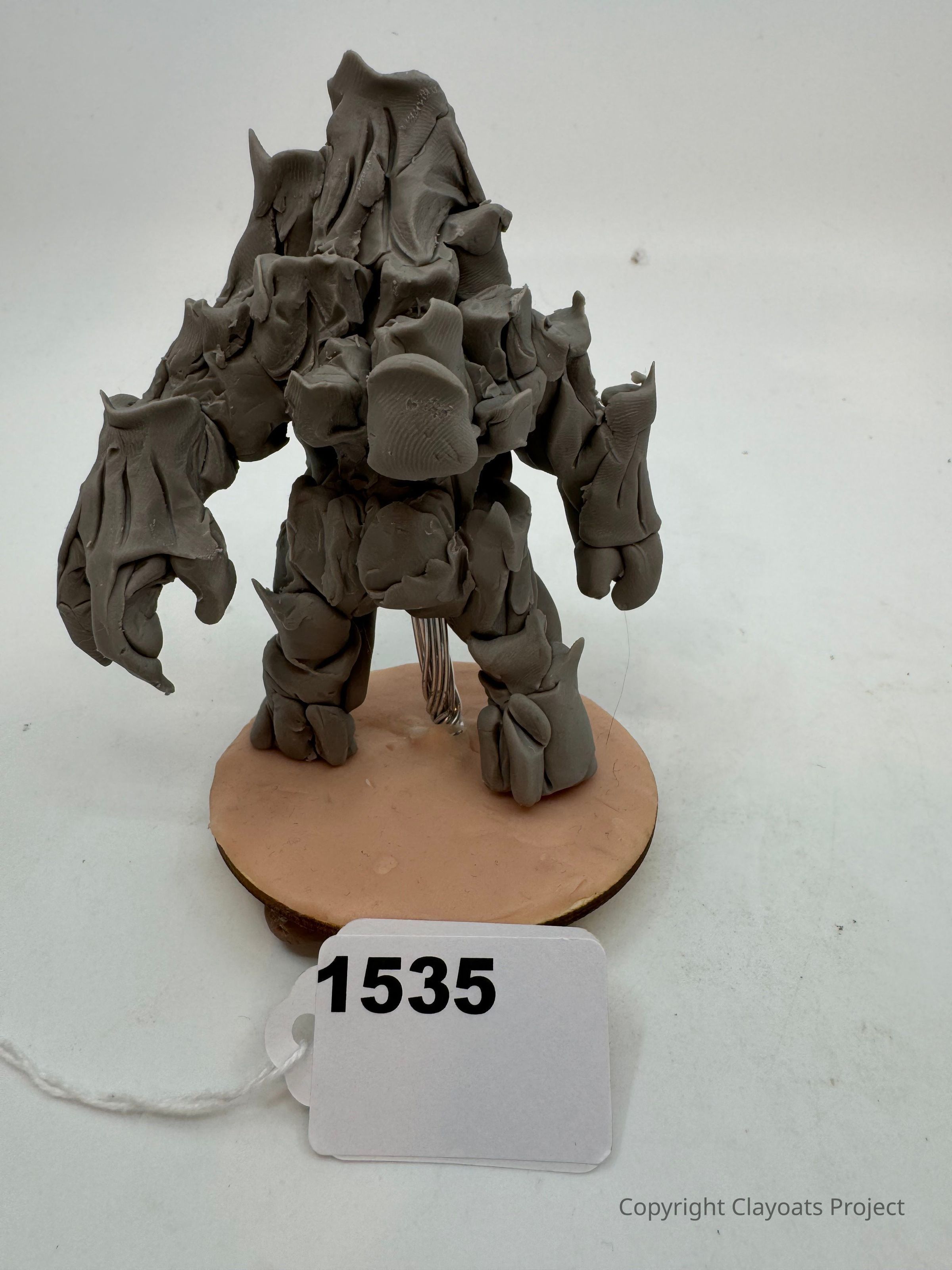 The image depicts a small, detailed sculpture of a creature made from a grey clay-like material with a rough, textured surface that resembles stone or bark. This figure stands on a circular, beige base and appears to have a humanoid form with thick limbs and a jagged, layered appearance, evoking the image of a golem or a rock monster.