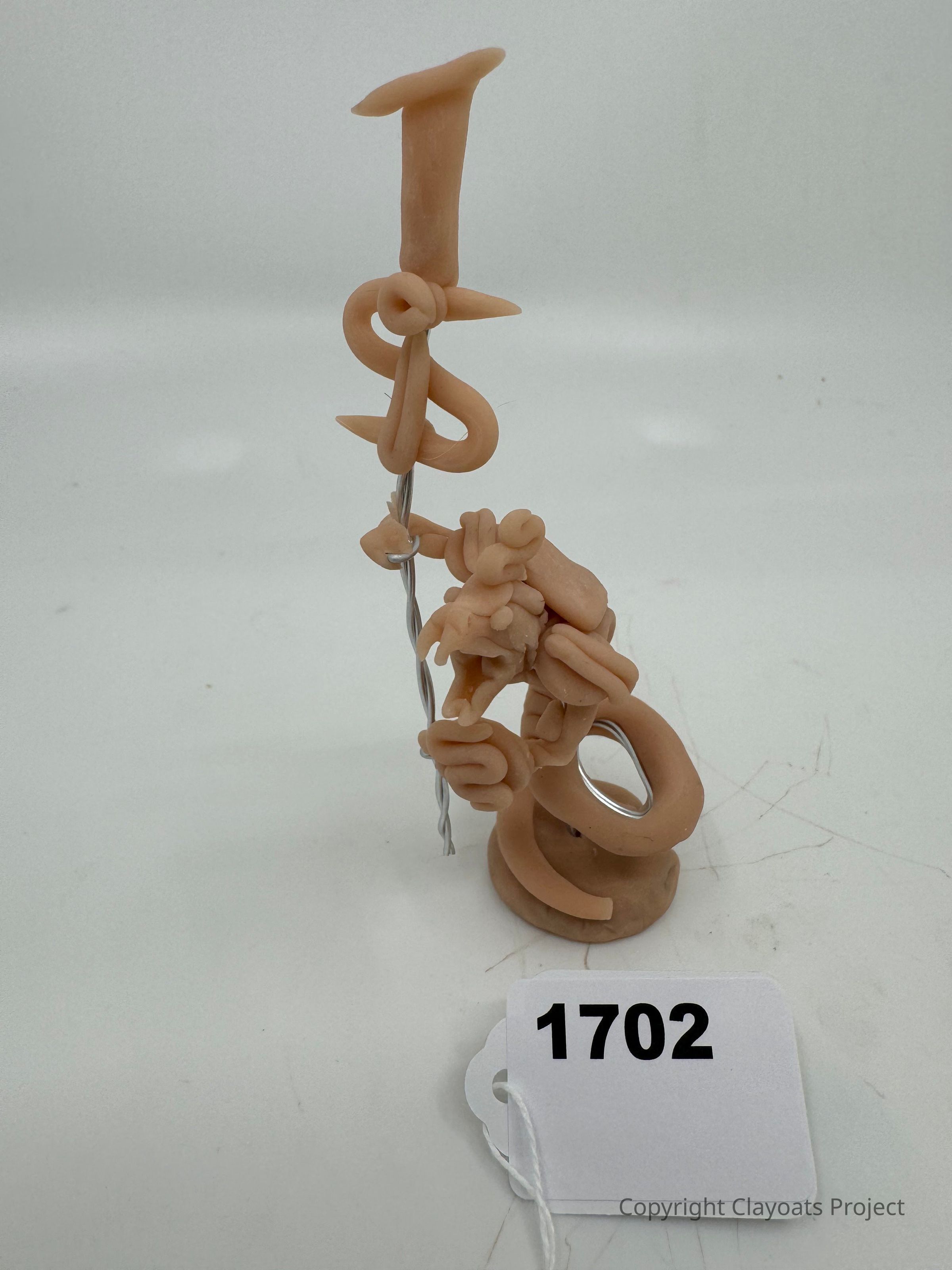 The image depicts a sculptural figure composed of beige modeling clay, intricately molded into abstract shapes with swirling and coiling forms, giving the appearance of an artistic and whimsical design. The sculpture is mounted on a wire stand . The background is a plain, light surface that enhances the visibility and focus on the sculpture, highlighting its creative structure and craftsmanship. The overall presentation suggests an