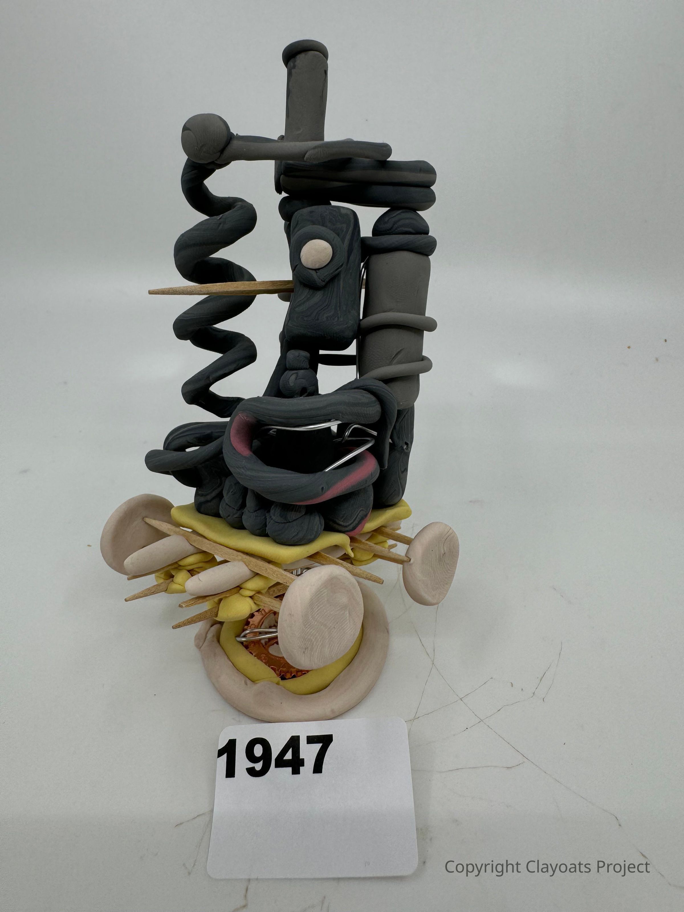 The image shows a unique abstract sculpture composed of various materials, including twisted black and gray structures resembling coils and rods, interspersed with circular and cylindrical shapes. A wooden stick protrudes from the formation, and there are beige and yellow elements at the base. The sculpture has a whimsical and modern feel, showcasing an interplay of shapes and textures that invite curiosity and interpretations.