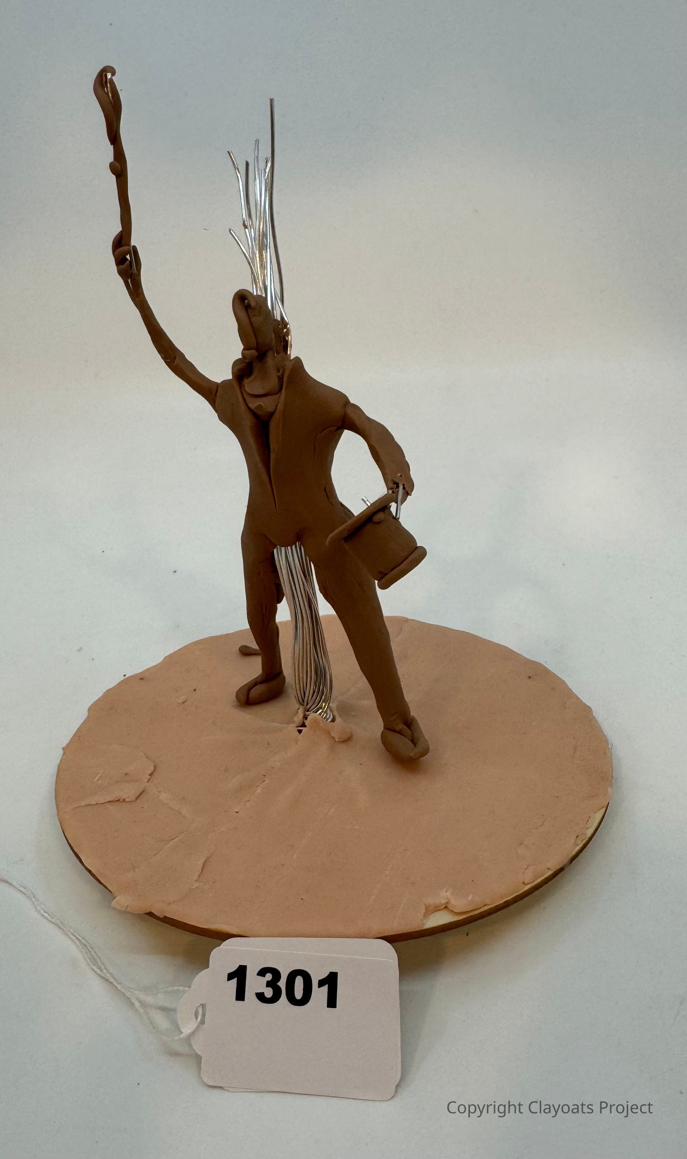 The image depicts a clay sculpture of a whimsical figure standing on a circular base, holding a staff in one hand and a container in the other; the figure features exaggerated proportions and metallic elements sprouting from its head, contributing to its fantastical appearance.