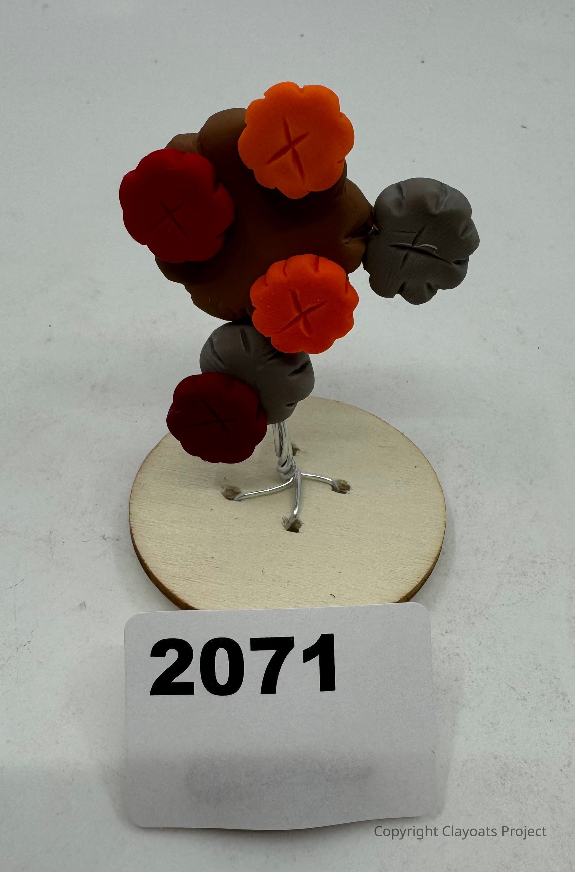 The image displays a model of a tree crafted with clay or a similar material, featuring a variety of colorful flower-like shapes in orange, red, and gray mounted on thin metal branches, all supported by a round wooden base.