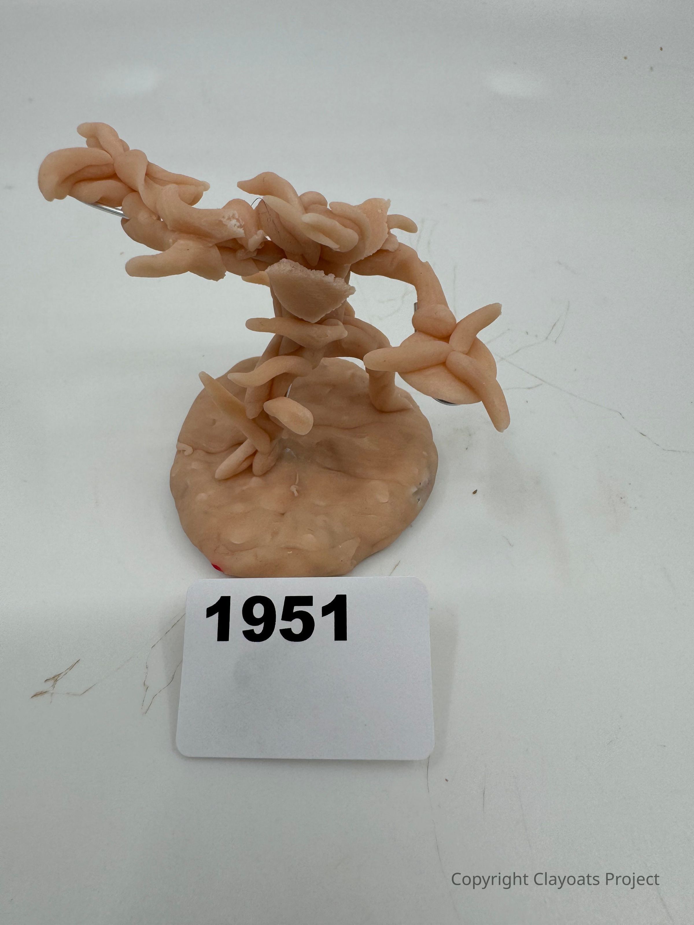 The image features a sculpture made of a pinkish-beige, clay-like material, intricately twisted into a unique, abstract form resembling organic shapes or branches on a flat base. The background is a plain white surface, which accentuates the intricate details of the sculpture and the simplicity of the card. The piece's organic design and soft color evoke a naturalistic and artistic aesthetic.