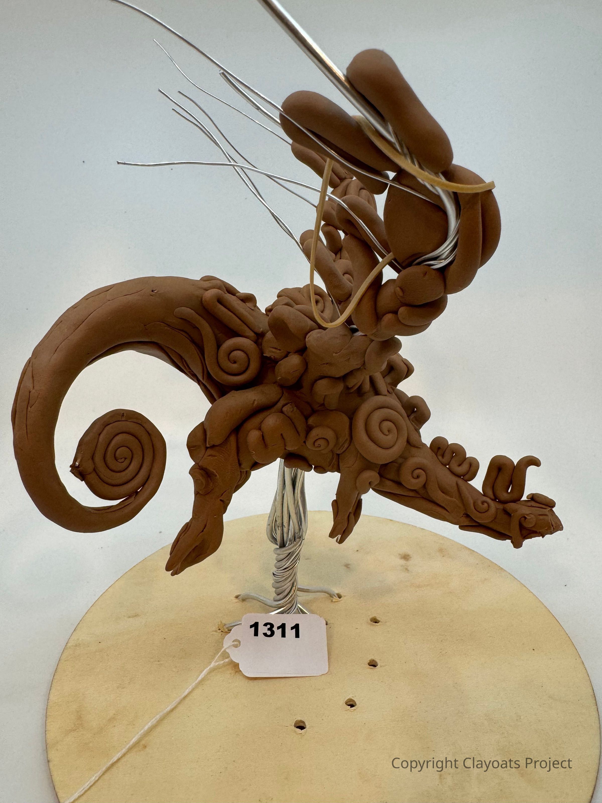 The image shows an intricately sculpted clay figure mounted on a circular wooden base. The sculpture features a twisting, serpentine form adorned with spiral and swirled patterns, giving it an organic, dynamic appearance. Metal wires protrude from the back, suggesting either an unfinished or abstract aspect to the design. The figure, with its curling tail and elongated snout, conveys a sense of movement and creativity, blending artistic elements with a somewhat mythical or fantastical theme
