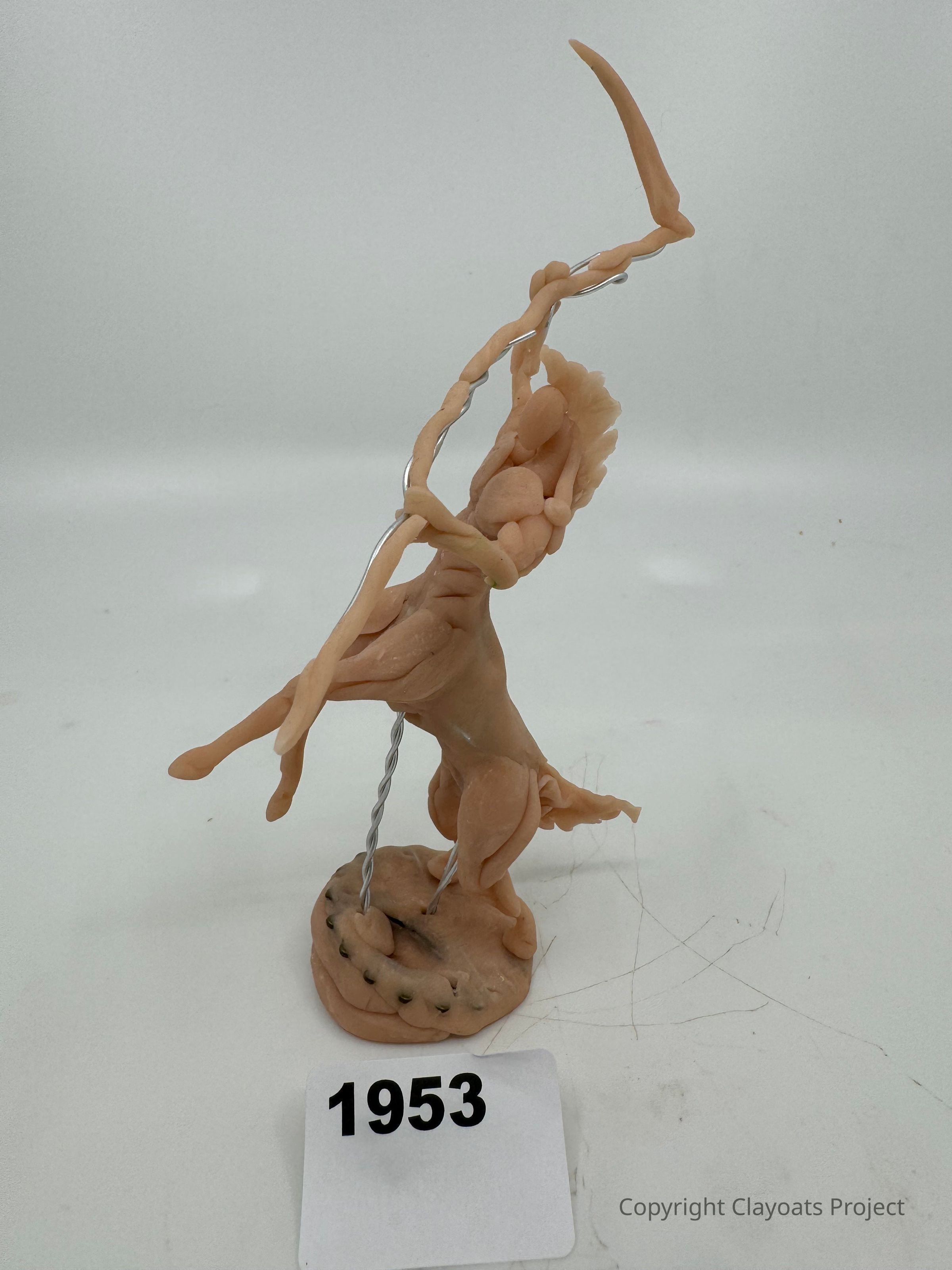 The image depicts a sculptural figure, likely made of a clay-like material, dynamically posed with an arm raised, possibly wielding an imaginary bow, standing on a textured circular base, with metal wires providing support.