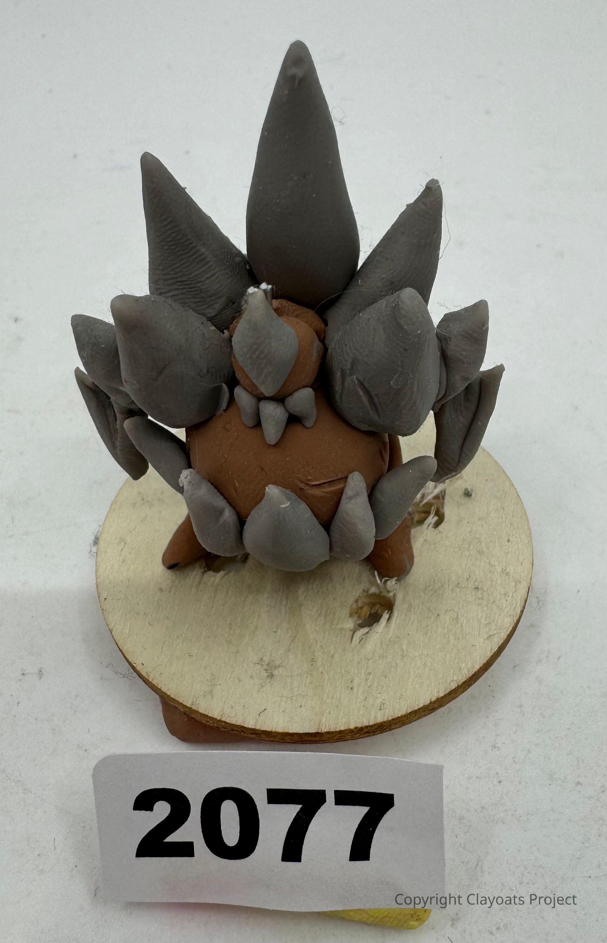 The image displays a handmade clay sculpture of a small creature with a round, brown body and multiple pointed, gray spikes protruding from its back, placed on a wooden base. It is all set against a neutral, light-colored background that highlights the crafted details and colors of the figurine.