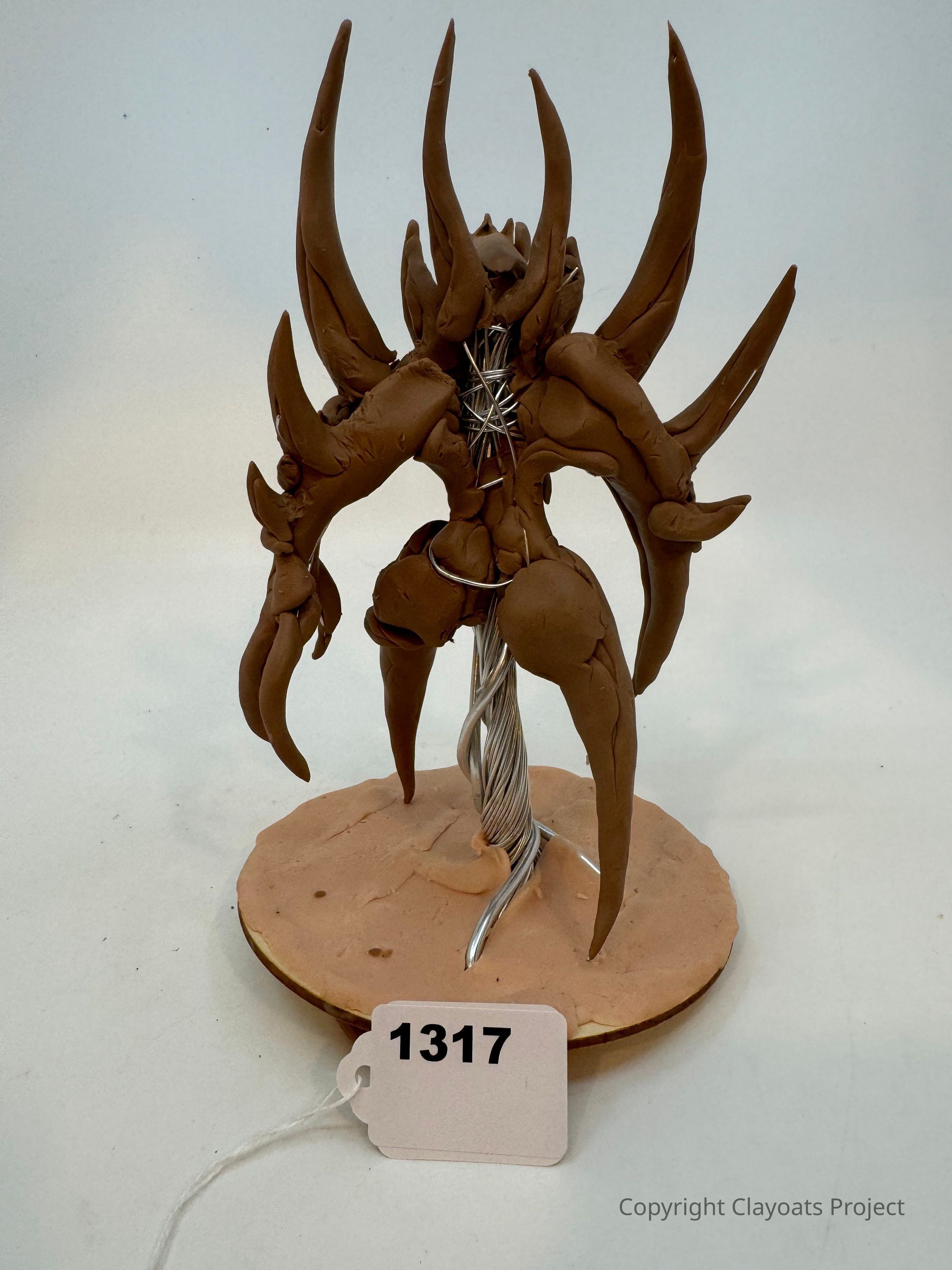 The image shows a handcrafted sculpture featuring an intricate, fantastical creature with numerous elongated, curved appendages resembling horns or claws, crafted from a brown material, likely clay. The creature stands on a circular base, supported by a central twisted metal wire structure visible at its core. This imaginative sculpture, conveys a sense of dynamic movement and otherworldly presence against a plain backdrop, highlighting the detailed craftsmanship involved in its creation.