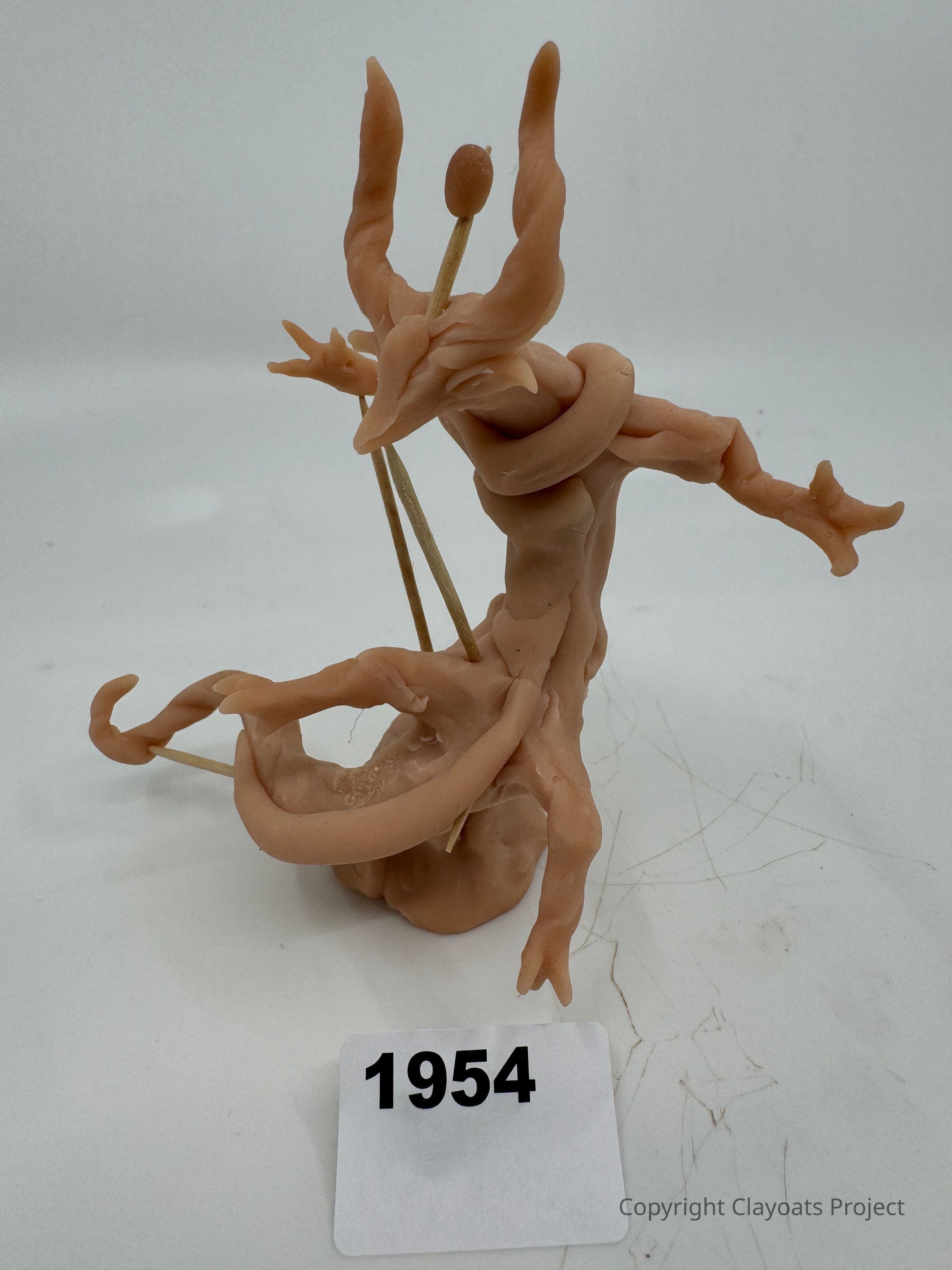 The image features a creatively sculpted figure made of clay, displaying an abstract form with elongated limbs and twisty shapes, reminiscent of mythical or fantastical creatures. The figure has two pronounced, upward-pointing horns and appears to be supported by thin sticks inserted into the clay. It stands on a solid base, with arms and tendrils extending outward, suggesting movement or energy.