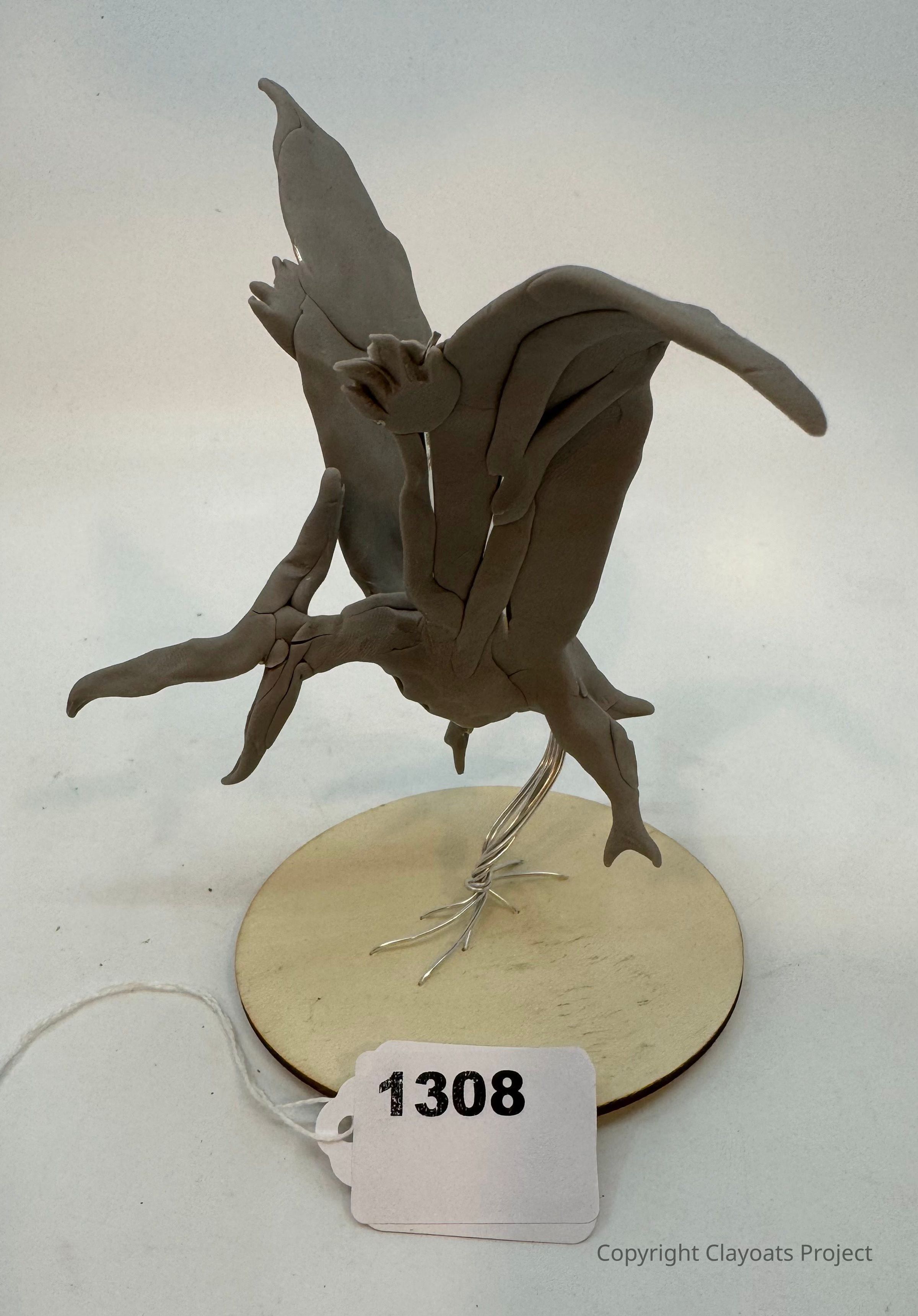 The image features a gray clay sculpture resembling a dynamic, abstract creature or bird with elongated limbs and wings, balanced delicately on a wire stand attached to a circular wooden base. The sculpture appears to be mid-motion, suggesting movement or flight, and exhibits a modern, artistic style, against a plain, muted background that highlights the artwork's intricate design