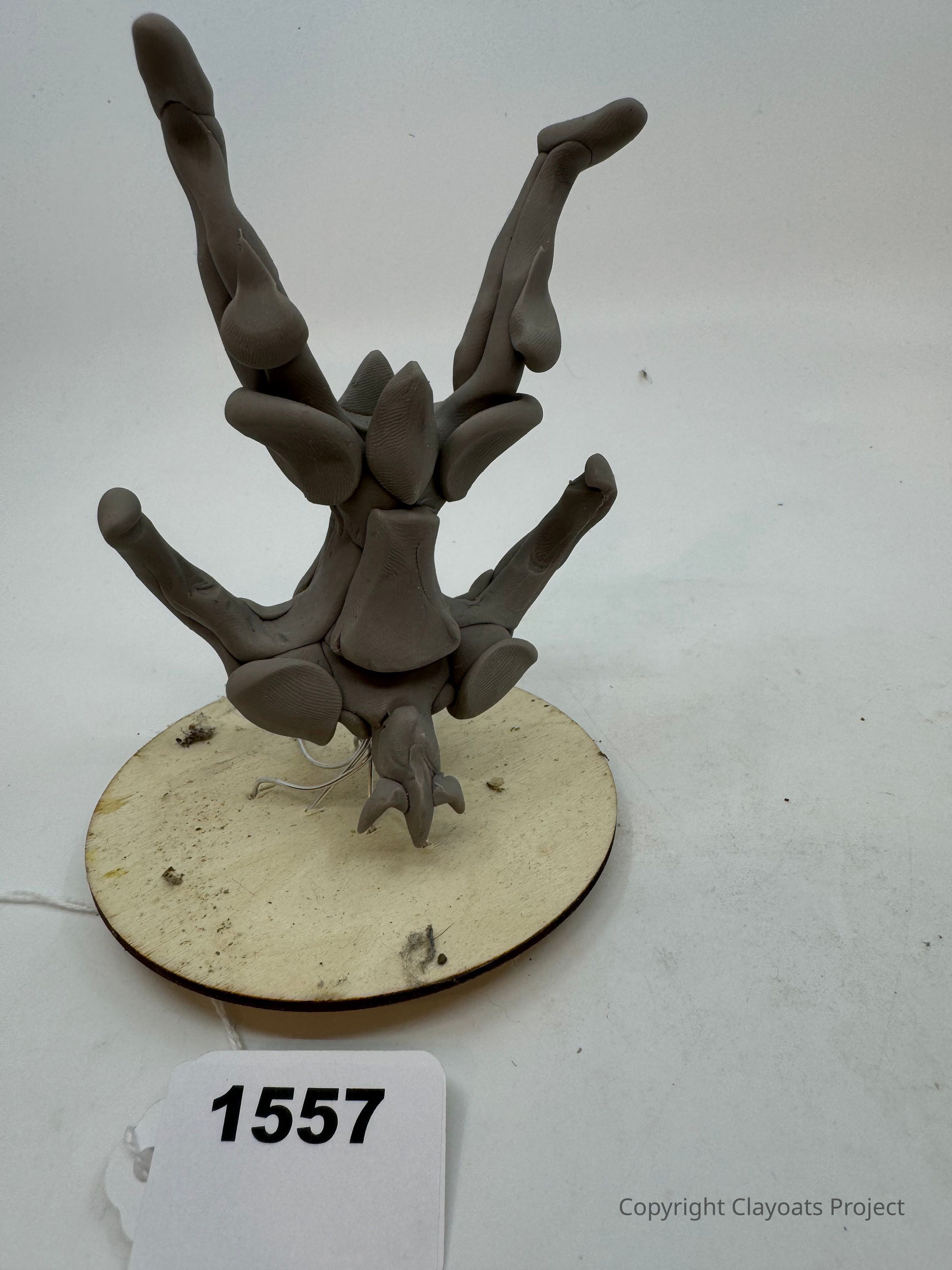 The image features an abstract, gray clay sculpture with multiple curved protrusions arranged vertically on a round wooden base, surrounded by a neutral background. The sculpture resembles intertwining organic forms or tentacles reaching upward, showcasing a dynamic, flowing design. The base appears slightly worn, with a few dust particles visible, adding a touch of texture to the otherwise smooth surface.