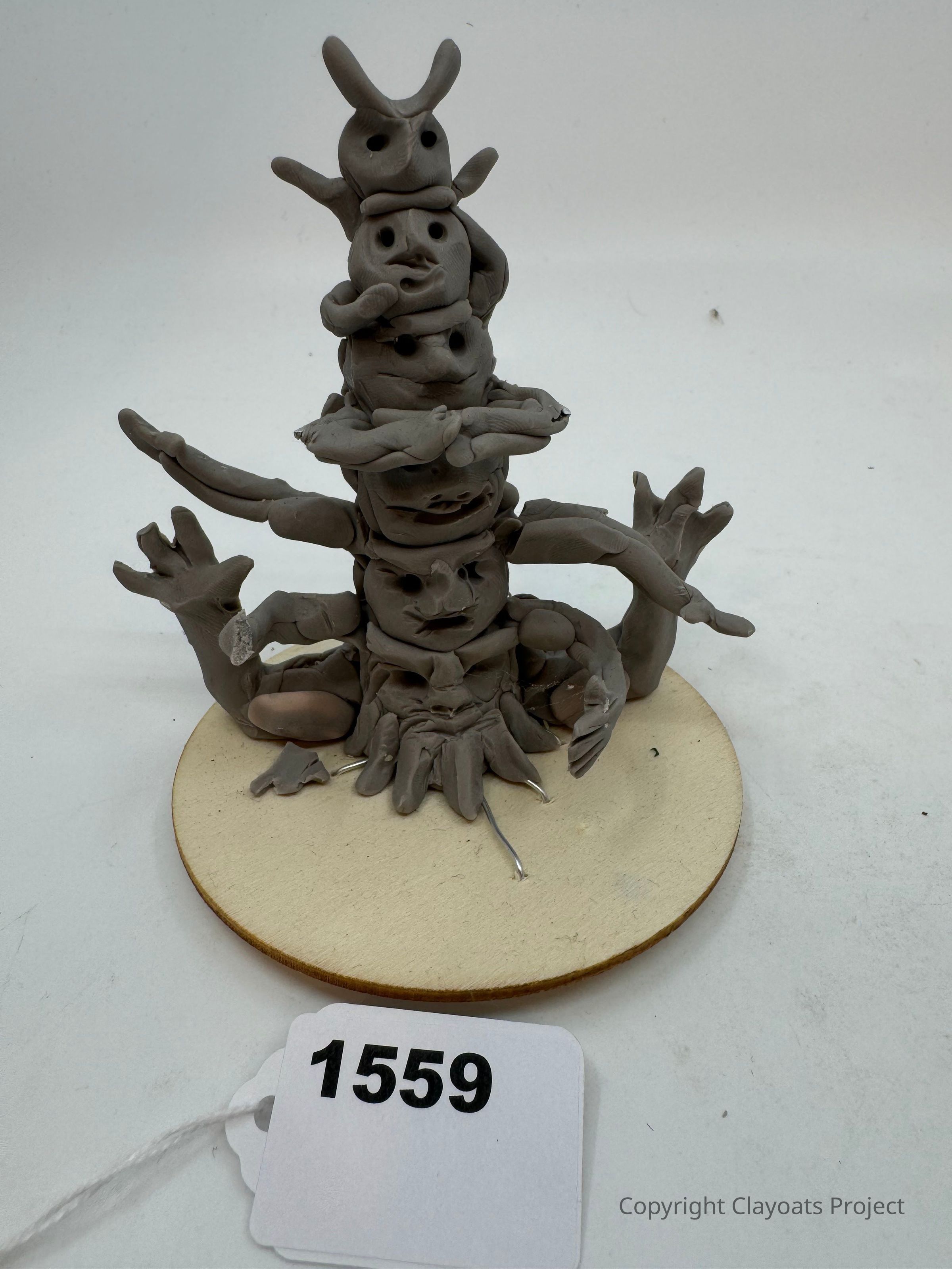 The image depicts a unique clay sculpture with multiple stacked faces and expressive features, including protruding eyes and hands, arranged creatively atop a circular base, which appears to evoke an abstract or imaginative artistic concept; its intricate details suggest meticulous attention to design, possibly symbolizing a fusion of human facial elements in a whimsical expression.