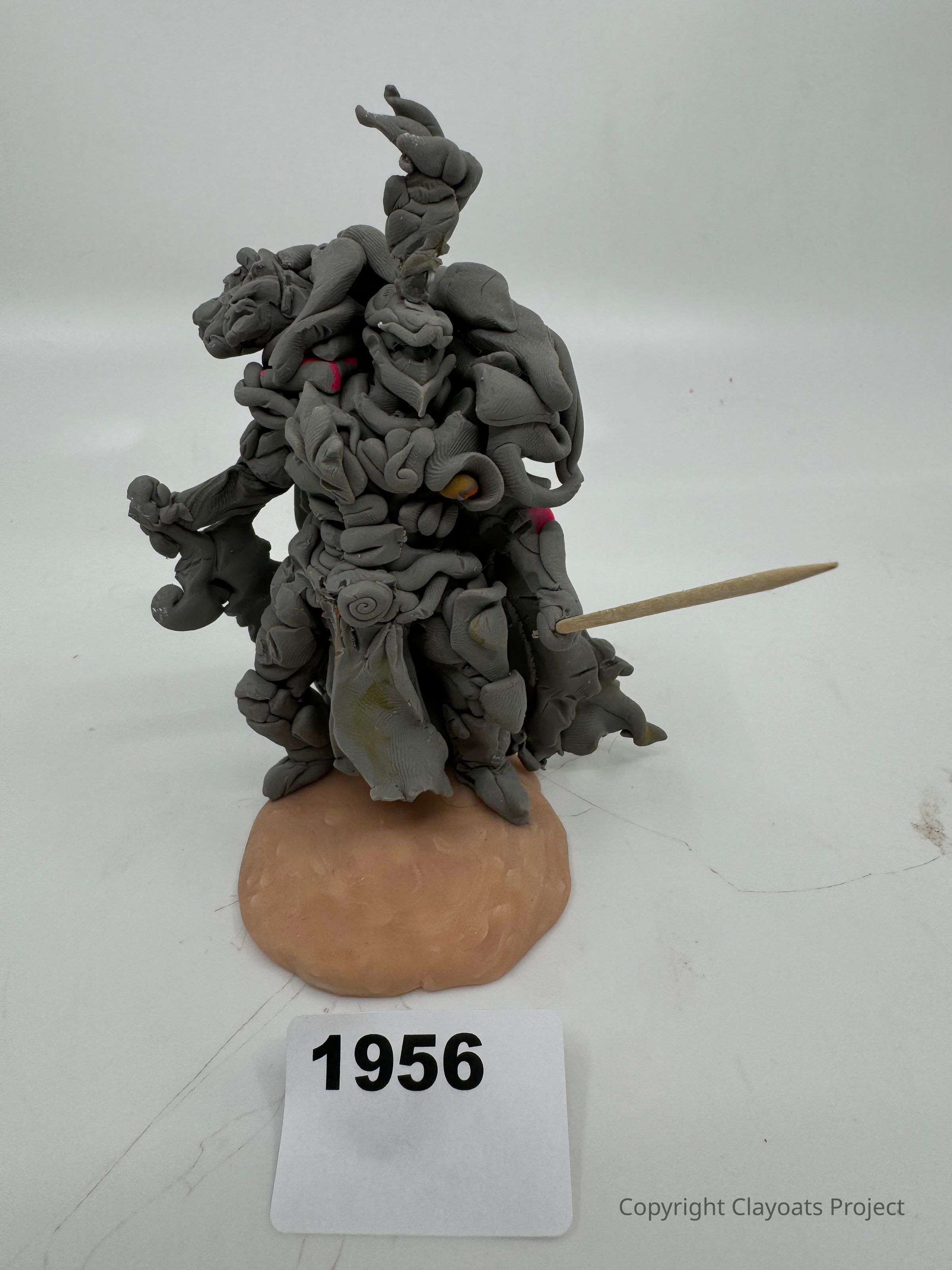 The image depicts a gray, intricately designed sculpture resembling a fantasy creature or warrior, crafted from what seems to be clay or a similar material, standing on a light brown base; it features various textured elements and intricate patterns.