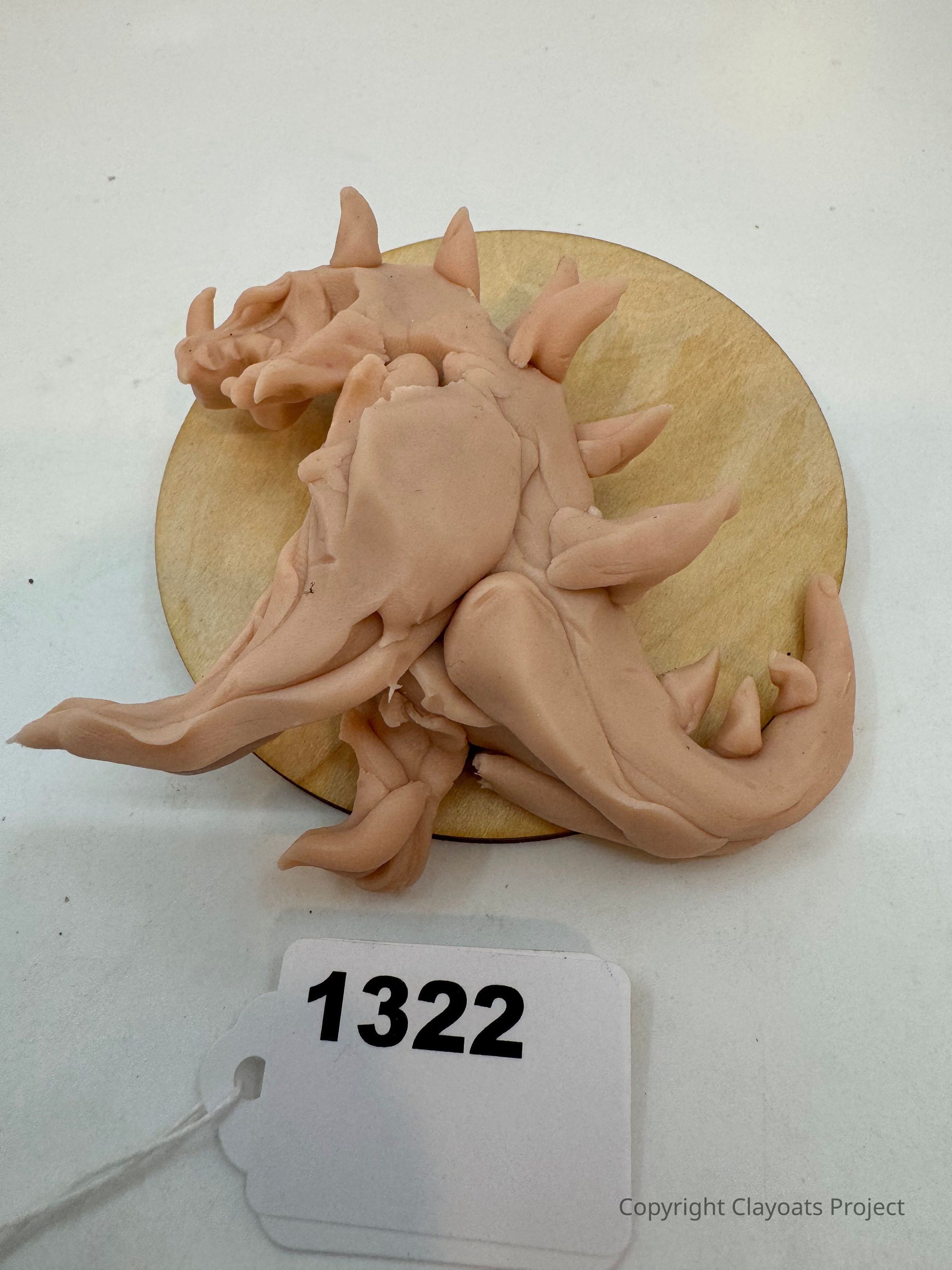 The image depicts a pink clay sculpture of a dragon with pronounced horns and spikes, placed atop a circular wooden base. The dragon is positioned sideways, with its tail curling around, and its wings folded along its back, presenting an artistic and imaginative representation of a fantasy creature. The base contrasts with the dragon's soft color, highlighting the intricate details of the sculpture. The scene reflects creativity and craftsmanship, offering an intriguing glimpse ...