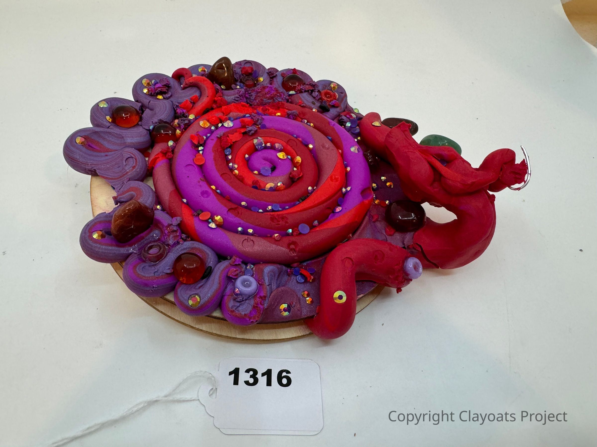 The image displays a vibrant and intricate clay sculpture featuring a spiral design in shades of red and purple, adorned with various embellishments like small beads and stones. Surrounding the central spiral are additional clay elements shaped like swirls, enhancing the complexity and artistic appeal. The sculpture rests on a flat circular base, showcasing a harmonious blend of colors and textures, with larger beads creating focal points at intervals. the artwork represents a striking and imaginative fusion of form and color