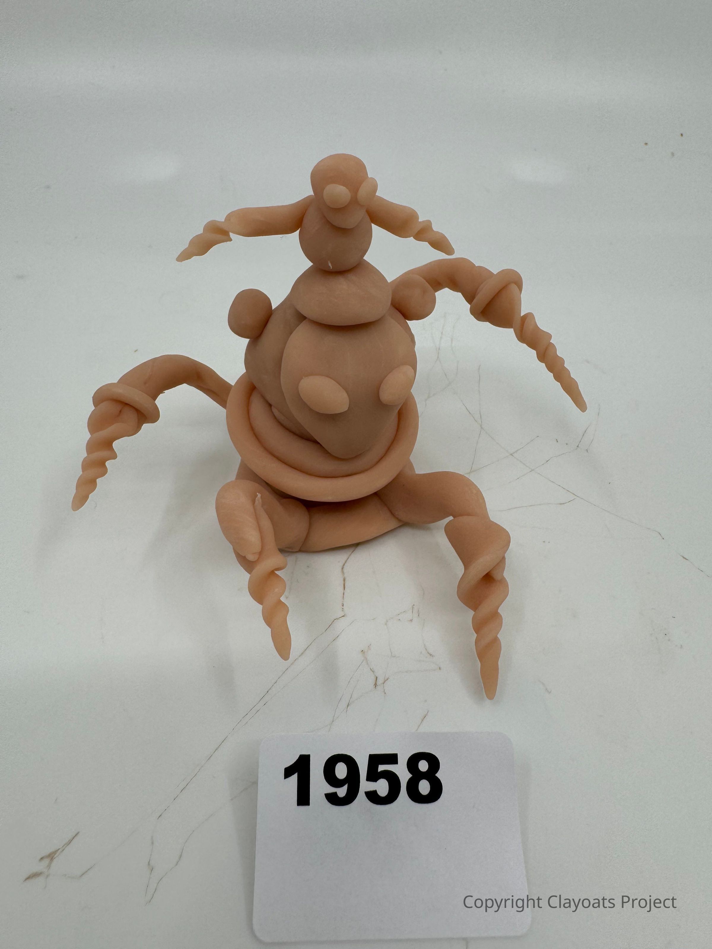 The image features a clay sculpture resembling an abstract creature with twisted limbs and a layered body, set against a plain background. Its round, smooth shapes and spiral extensions give it a whimsical appearance. The sculpture’s artistic design showcases creativity through its unconventional form, combining elements of fantasy and abstraction. The overall composition captures an engaging and imaginative artwork that invites interpretation and curiosity about its origin and meaning.